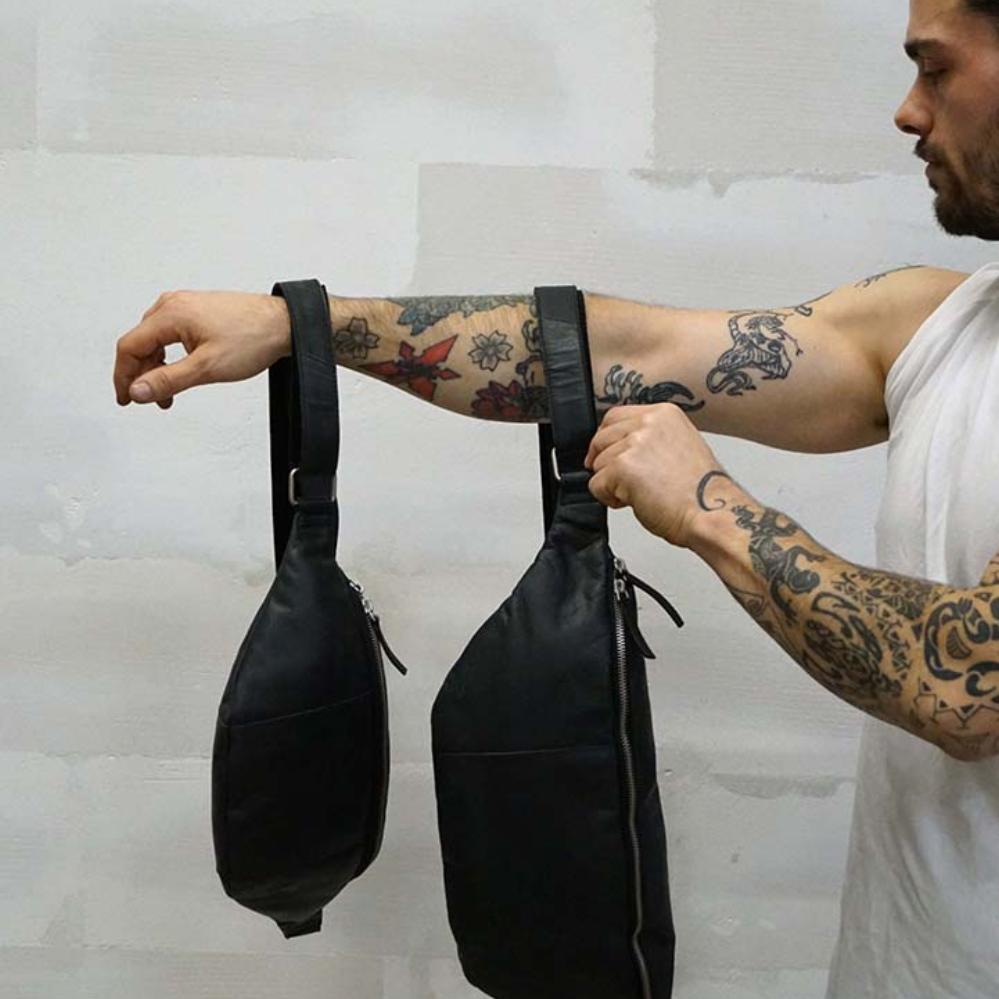 Die schwarze Unisex-Gürteltasche ist modisch, luxuriös, minimalistisch und stilvoll. Die Ledertasche hat Frontreißverschluß und einen verstellbaren Tragegurt 135 cm. Lässt sich quer über den Oberkörper tragen. Ideal, um nur das Nötigste zu tragen.