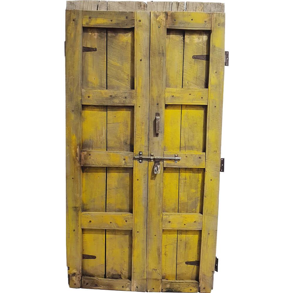 Diese wunderschöne alte Holztür strahlt pure Lebensfreude aus – mit ihrer abgenutzten, aber dennoch auffälligen gelben Farbe zieht sie alle Blicke auf sich. Eine Tür, die sich nicht versteckt. Sie ist aus massiven Planken gefertigt und mit waagerechten Verstrebungen und rustikalen Scharnieren versehen. Der Farbton ist mit Würde gealtert, und dunkle Spuren, abgeplatzter Lack und Patina verleihen der Oberfläche Tiefe und Charakter. In der Mitte befindet sich ein grober Schließmechanismus mit Vorhängeschloss, der einen Hauch von rohem Charme versprüht und auf eine Vergangenheit hinweist, in der diese Tür etwas Wertvolles bewachte. Ein farbenfrohes Vintage-Schmuckstück – ideal als Wandpaneel, Dekoration im Eingangsbereich oder als Gesprächsstoff in jedem Raum mit Sinn für Persönlichkeit und Geschichte.