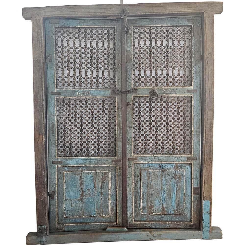 Diese schöne alte Tür strahlt Charakter und Geschichte aus. Ihr Holzrahmen in patiniertem Blau und natürlichen Farbtönen wird mit einem detaillierten Eisengitter kombiniert, das der Tür einen einzigartigen Ausdruck verleiht. Das Gitter fügt eine industrielle Note hinzu, während die abgenutzte Holzoberfläche Wärme und Charme schafft. Diese Tür ist funktional und ein Blickfang, perfekt als Wanddekoration, dekorativer Raumteiler oder als Teil eines größeren Projekts mit wiederverwendeten Materialien. Eine alte Holztür, die wirklich ihre eigene Geschichte erzählt.