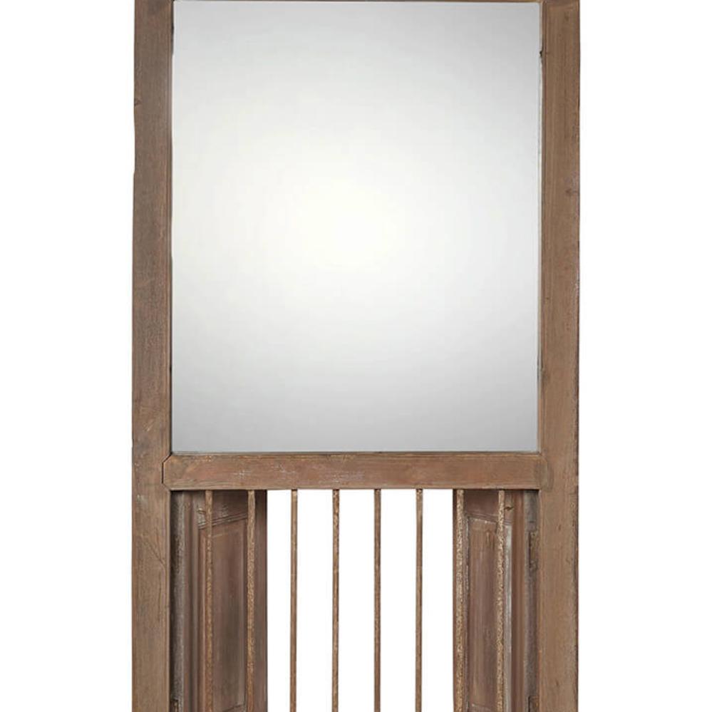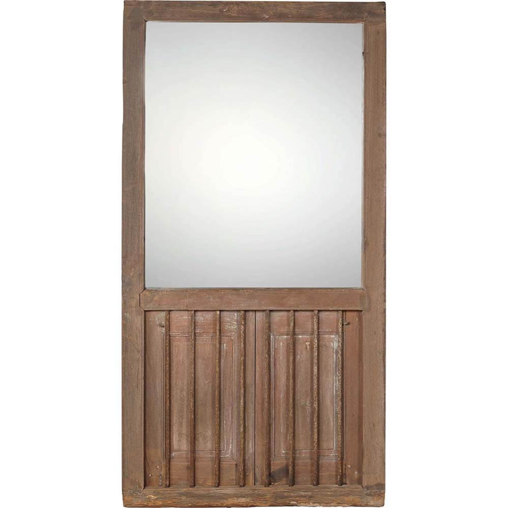 Dieser einzigartige Spiegelrahmen wurde aus einer authentischen alten indischen Tür gefertigt und strahlt Geschichte und rustikalen Charme aus. Die massive Holzkonstruktion zeigt eine schöne Patina und sichtbare Gebrauchsspuren, die dem Spiegel einen besonderen Charakter verleihen. Der Spiegel ist im oberen Teil der Tür montiert, während der untere Teil die originalen Details und Schnitzereien präsentiert, die die Herkunft des Handwerks widerspiegeln. Perfekt als Statement-Möbelstück im Eingangsbereich, Schlafzimmer oder Geschäft, um dem Raum Wärme und Seele zu verleihen.