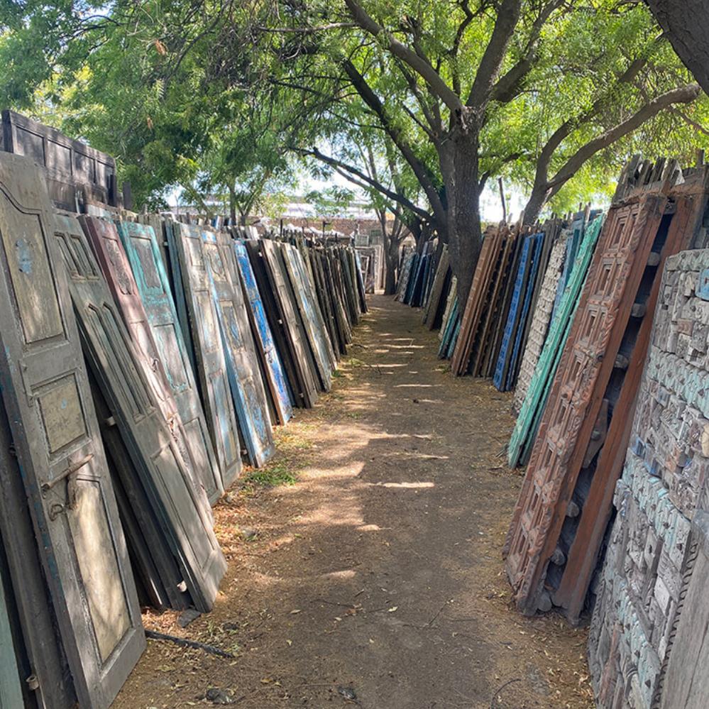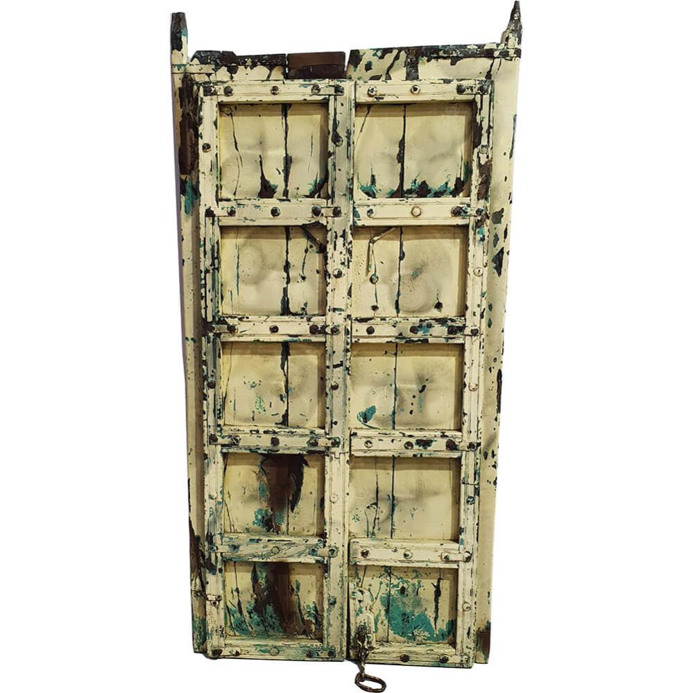 Diese wunderschöne alte Holztür in einem gedeckten Gelbton ist alles andere als langweilig. Sie steckt voller Details und Patina, die ihre Geschichte deutlich erzählen. Dunkle Risse, abgeplatzte Farbe und Spuren türkisgrüner Pinselstriche machen die Tür zu einem echten Blickfang – fast schon ein Kunstwerk in ihrer Unvollkommenheit. Die kleinen quadratischen Felder und die rustikalen Eisennägel verleihen der Tür einen grafischen Rhythmus. Unten hängt noch eine rostige Metallkette – vielleicht hat sie einst etwas Wichtiges verschlossen. Heute ist sie ein charmantes Relikt aus dem früheren Leben der Tür. Verwenden Sie die Tür als einzigartiges Deko-Element, an der Wand lehnend oder als Teil einer kreativen Einrichtung. Eines ist sicher: Diese Tür trägt Geschichten in sich – und ist bereit, Teil Ihrer zu werden.