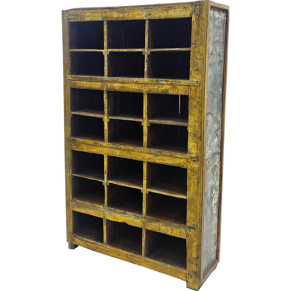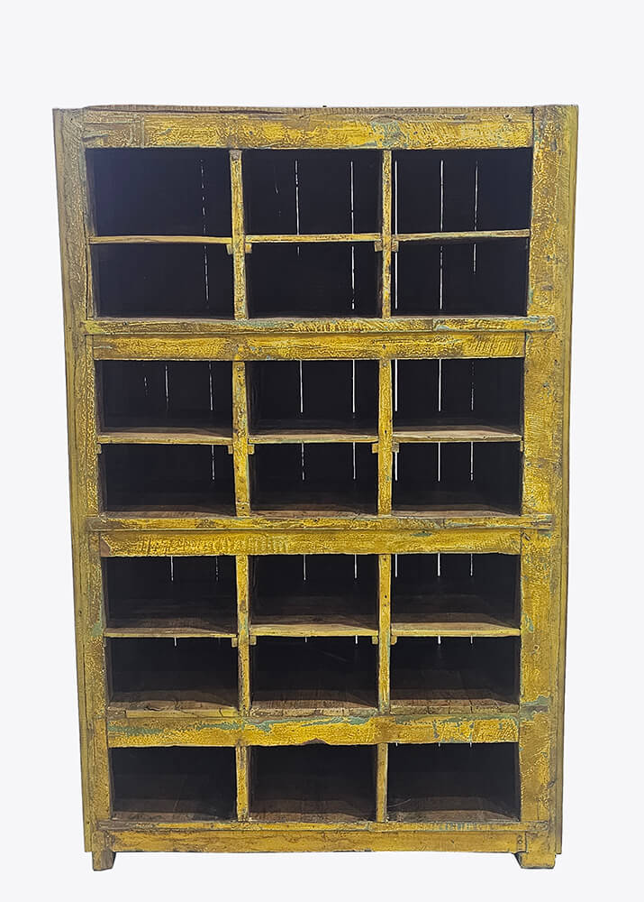 Gelbes Holzregal mit 21 Fächern