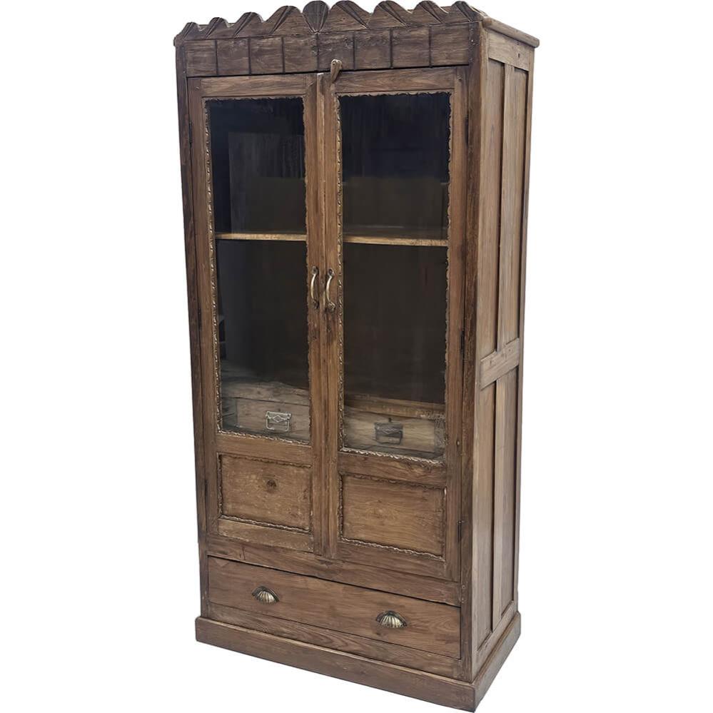 Ein beeindruckender Vitrinenschrank mit viel Charakter und schönen Details. Der Schrank ist aus Holz gefertigt und verfügt über Glastüren, die einen schönen Blick auf den Inhalt ermöglichen, sowie über Fächer und geräumige Schubladen zur Aufbewahrung. Die geschnitzten Kanten und der dekorative obere Abschluss verleihen dem Schrank einen besonderen Ausdruck, während die natürliche Oberfläche die Struktur und Geschichte des Holzes hervorhebt. Dieser große Vitrinenschrank passt perfekt in ein Zuhause oder Geschäft, wo er sowohl Wärme als auch praktischen Stauraum bietet. Ein Möbelstück mit einzigartigem Handwerk und zeitlosem Charme, das schnell zum Blickfang im Raum wird.