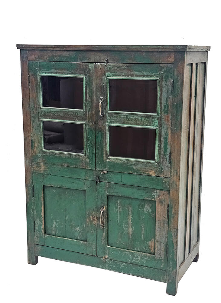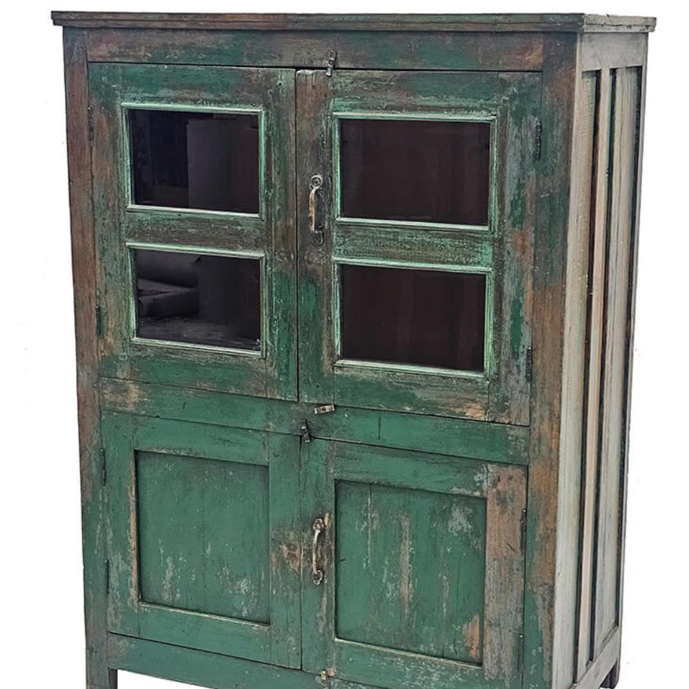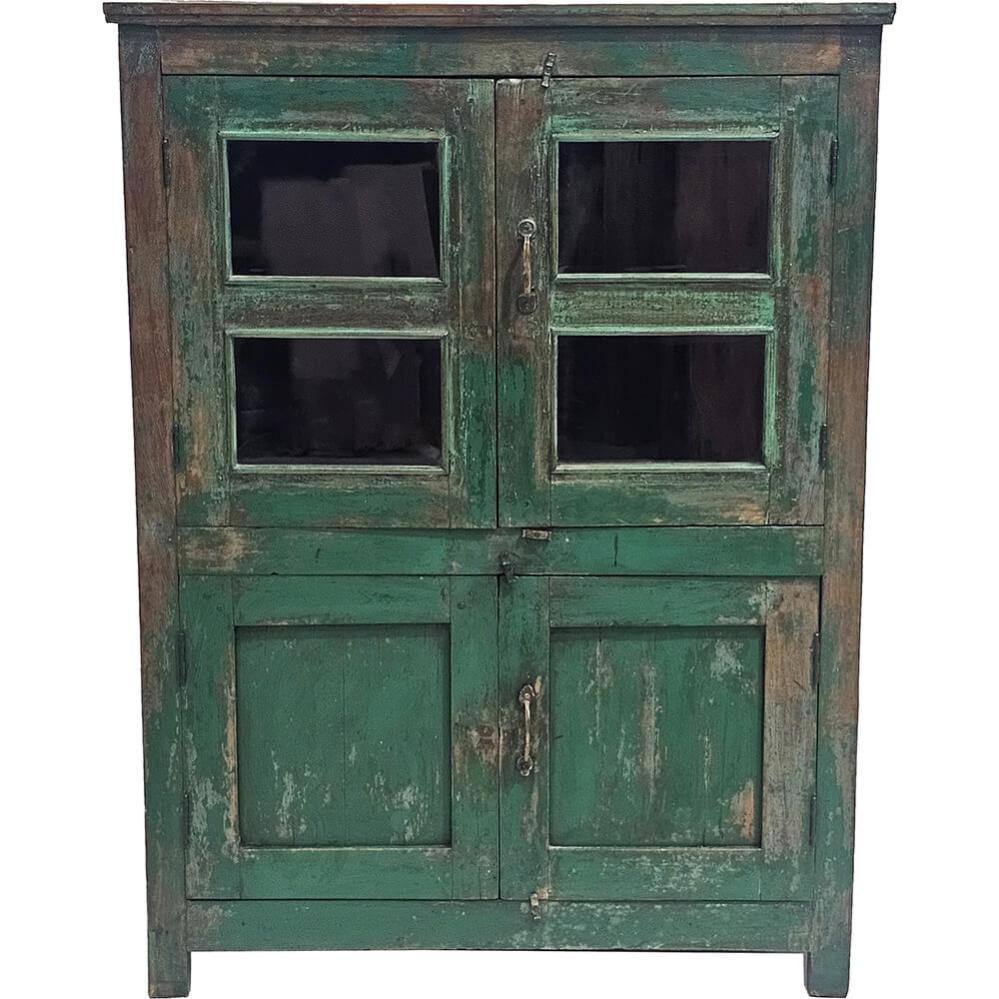 Wunderschöner, grüner Vitrinenschrank mit vier Türen, der Funktionalität mit einem authentischen, rustikalen Ausdruck verbindet. Der Holzschrank hat eine schön patinierte Oberfläche, bei der die grüne Farbe durch natürlichen Abrieb und Gebrauchsspuren ihren ganz eigenen Charakter erhält. Die oberen Türen sind mit Glas versehen, sodass Sie Ihr Lieblingsgeschirr, Bücher oder Dekorationsobjekte stilvoll präsentieren können, während die unteren Türen Platz für diskrete Aufbewahrung bieten. Ein vielseitiges Möbelstück, das Wärme und Persönlichkeit in der Küche, im Wohnzimmer oder Flur bringt – und mit seiner markanten Farbe und Struktur zu einem echten Blickfang in der Einrichtung wird.