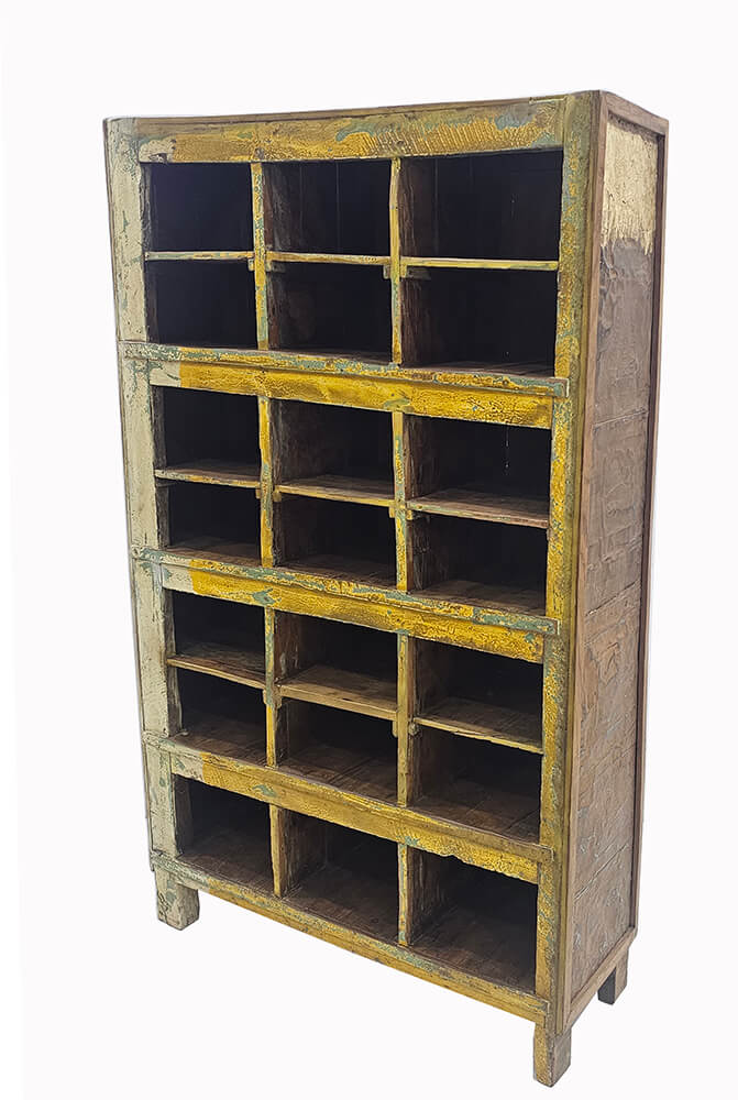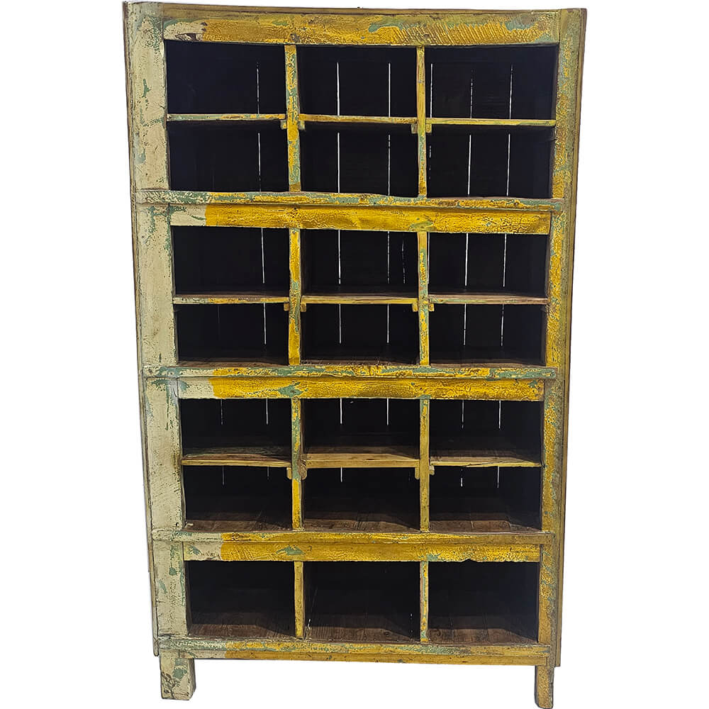 Dieses gelbe Regal mit 21 Fächern ist ein charaktervolles und funktionales Möbelstück mit viel Patina und Geschichte. Das Regal ist aus massivem Holz gefertigt und in ein harmonisches Gitter aus kleinen Fächern unterteilt, die für einen ruhigen und strukturierten Ausdruck sorgen. Die abgenutzte gelbe Farbe ist an vielen Stellen schön abgeblättert und legt ältere Farbschichten sowie die natürliche Holzoberfläche frei, die dem Regal Tiefe und Persönlichkeit verleihen. Jedes Fach weist eigene Variationen in Farbe und Abnutzung auf, und gerade diese Unterschiede machen das Regal lebendig und einzigartig. Die dunkleren Innenflächen bilden einen schönen Kontrast zum warmen Gelbton und heben den Inhalt der Fächer besonders hervor. Das Regal eignet sich ideal zur Aufbewahrung und Präsentation von kleinen Gegenständen, Keramik, Glas oder Büchern sowie als Sortiermöbel in der Küche, im Büro oder Geschäft.