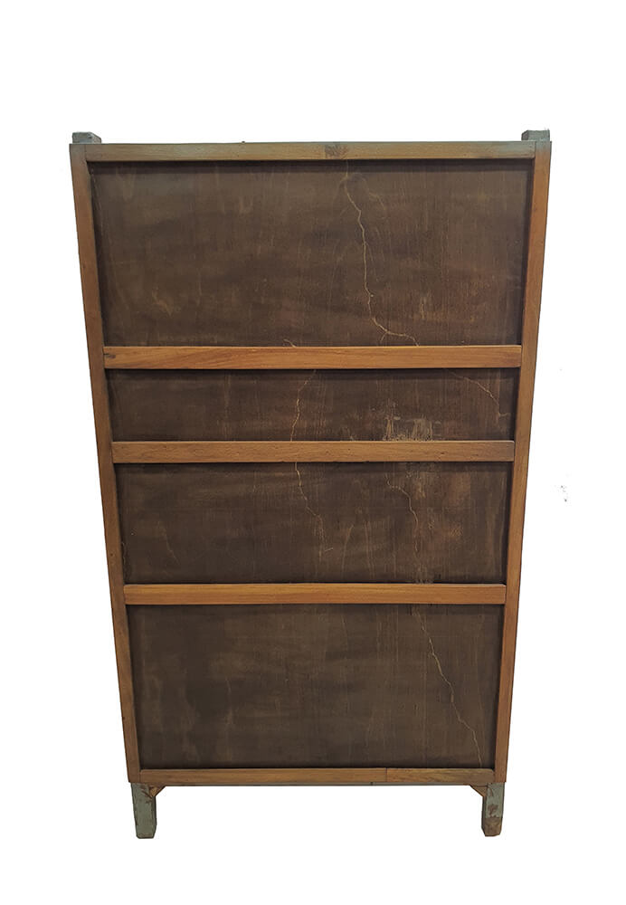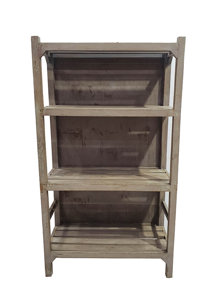Hier ist ein altes Holzregal, das sein Alter nicht versteckt, und das muss es auch nicht. Die offenen Lamellen verleihen dem robusten Ausdruck Leichtigkeit und Luftigkeit, und das Ganze ist in einer Konstruktion zusammengefügt, die schlicht und langlebig ist. Das Regal wurde in Indien gefunden und trägt deutliche Spuren seiner Vergangenheit. Es ist rustikal und voller Charme. Nutzen Sie das Regal im Geschäft zur charaktervollen Präsentation Ihrer Waren, im Restaurant für Geschirr oder Wein oder zu Hause in der Küche oder im Wohnzimmer, in denen rohe Aufbewahrung mit Persönlichkeit gefragt ist. Ein Holzregal, das funktional ist und zugleich eine Geschichte erzählt.
