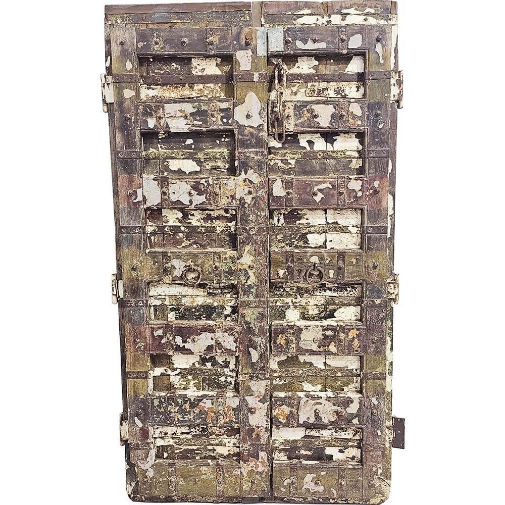 Eine faszinierende alte Holztür, bei der die Spuren der Zeit ein raues und einzigartiges Erscheinungsbild geschaffen haben. Die abgeblätterten weißen und gelben Farbreste offenbaren Schichten von Geschichte, während die massiven Eisenverstärkungen einen authentischen, rustikalen Charme verleihen. Diese Tür setzt in jeder Einrichtung ein starkes Statement – ob als kunstvolle Wanddekoration, Raumtrenner oder markanter Eingang, der Patina und Persönlichkeit ausstrahlt.