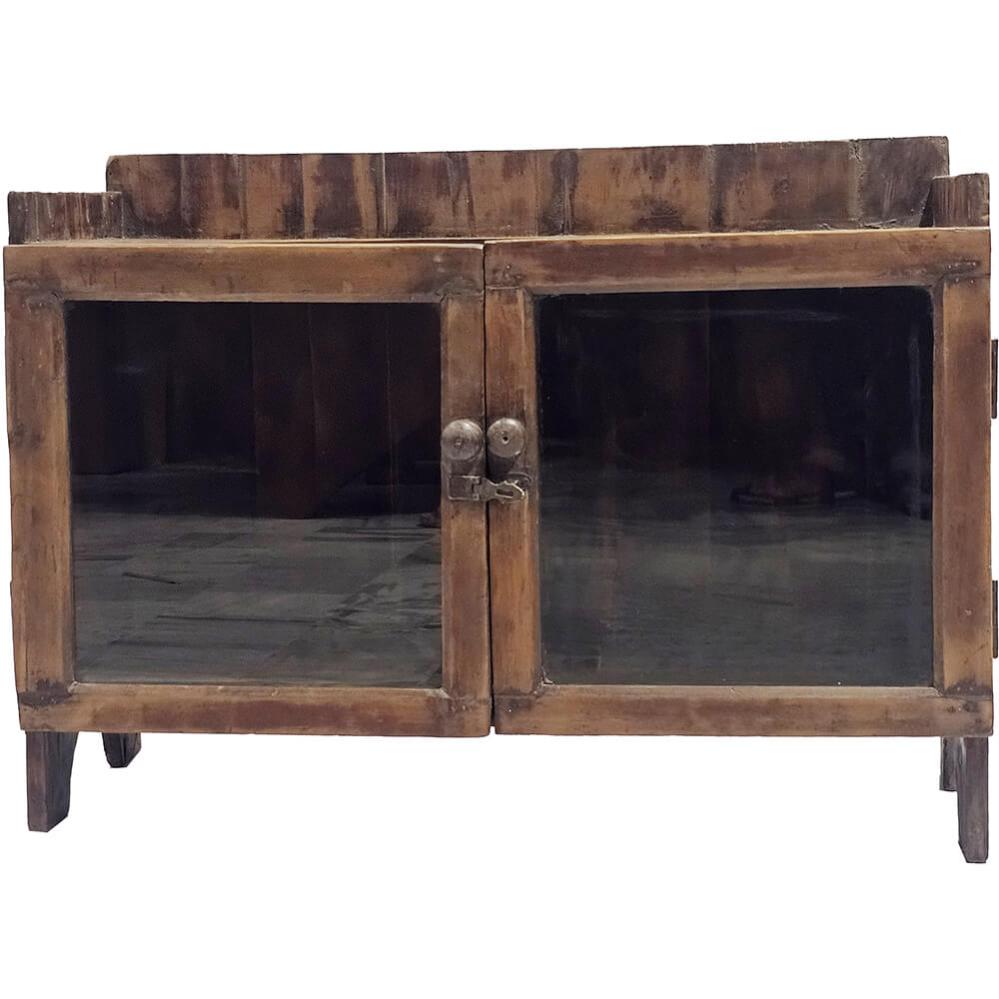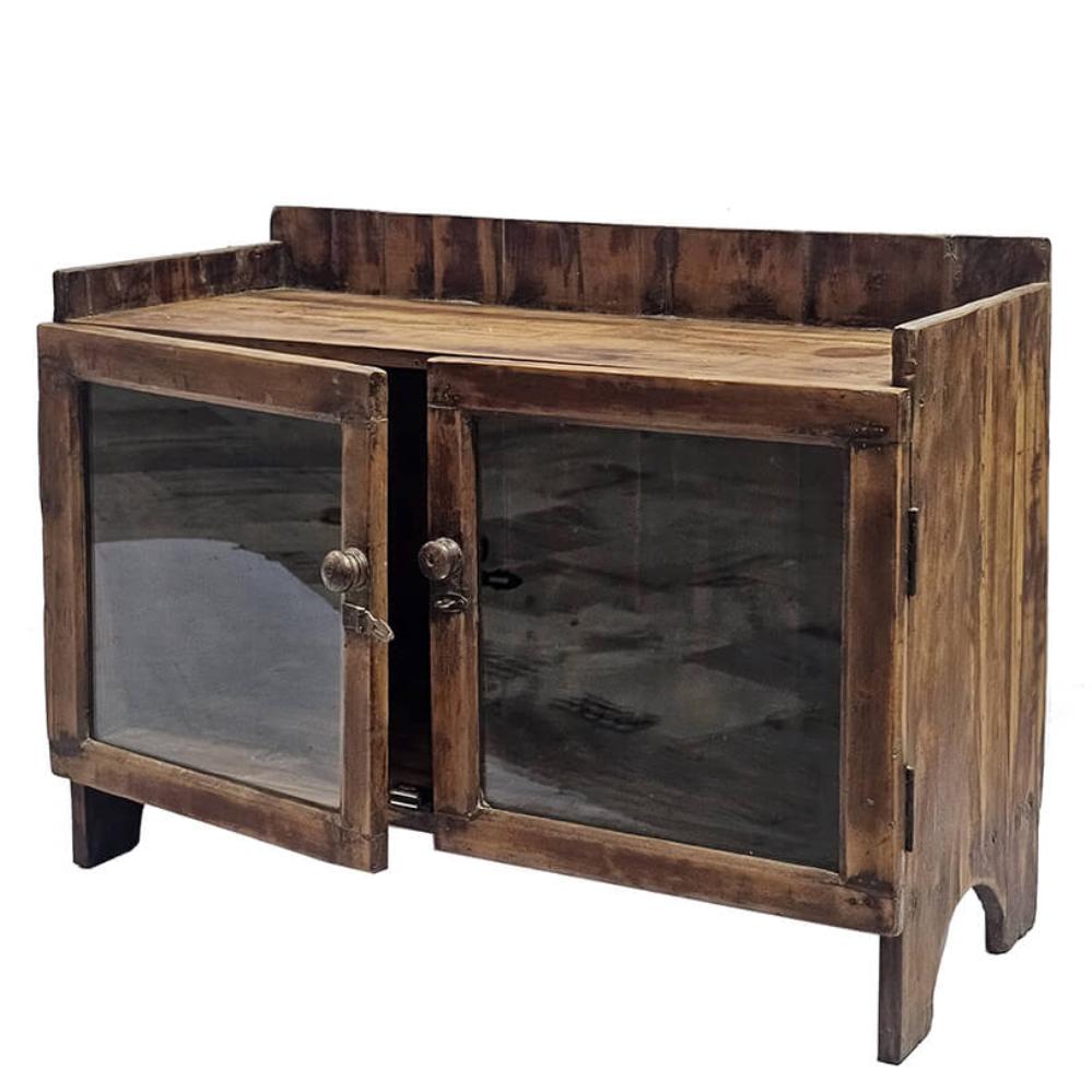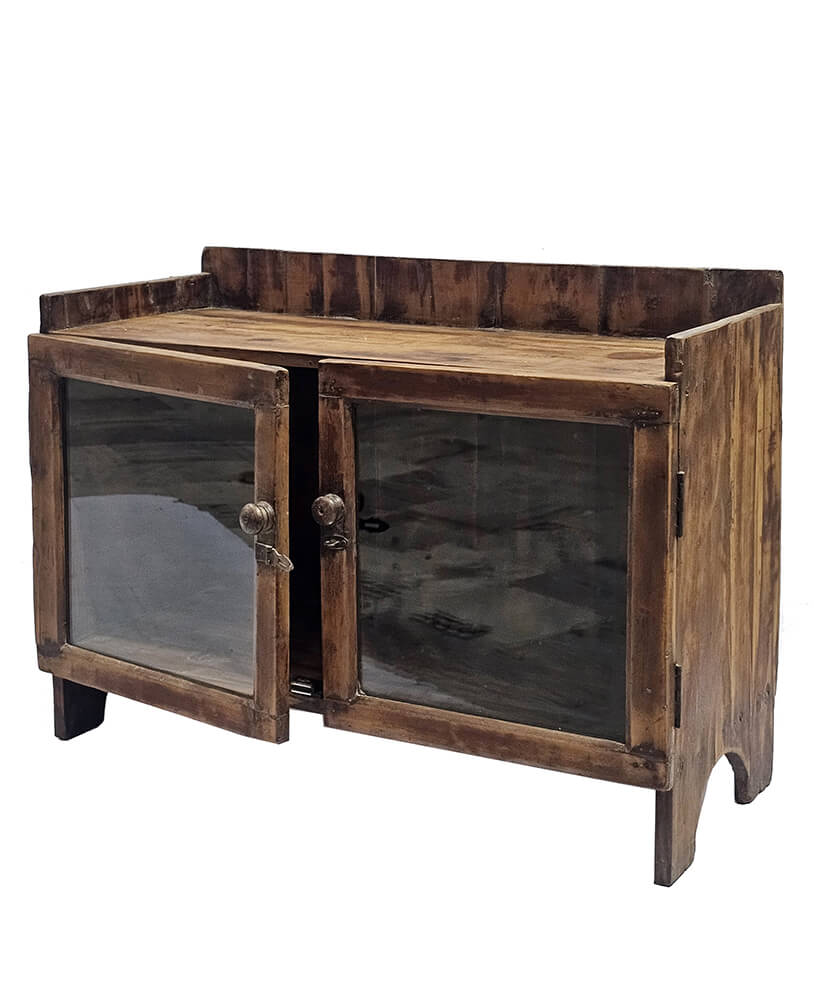 Diese hübsche kleine Anrichte ist aus Holz gefertigt und hat eine warme, natürliche Oberfläche, die ihr ein authentisches und zeitloses Erscheinungsbild verleiht. Die beiden Glastüren mit schlichten Holzrahmen ermöglichen es, Lieblingsstücke stilvoll zu präsentieren und gleichzeitig ordentlich zu verstauen, während das Möbelstück optisch leicht und luftig bleibt. Die dezente Patina und feinen handwerklichen Details zeugen von solider Handwerkskunst und verleihen der Anrichte viel Charakter. Sie passt perfekt ins Wohnzimmer, in den Flur oder als charmante Aufbewahrungslösung in einem Café oder Geschäft. Ein vielseitiges Möbelstück, das praktische Funktionalität mit einem rustikalen und ursprünglichen Ausdruck verbindet.