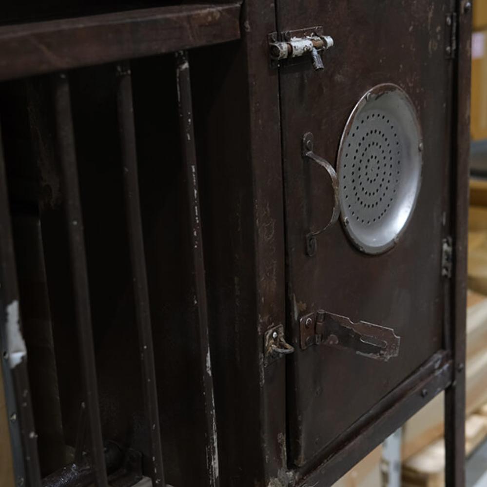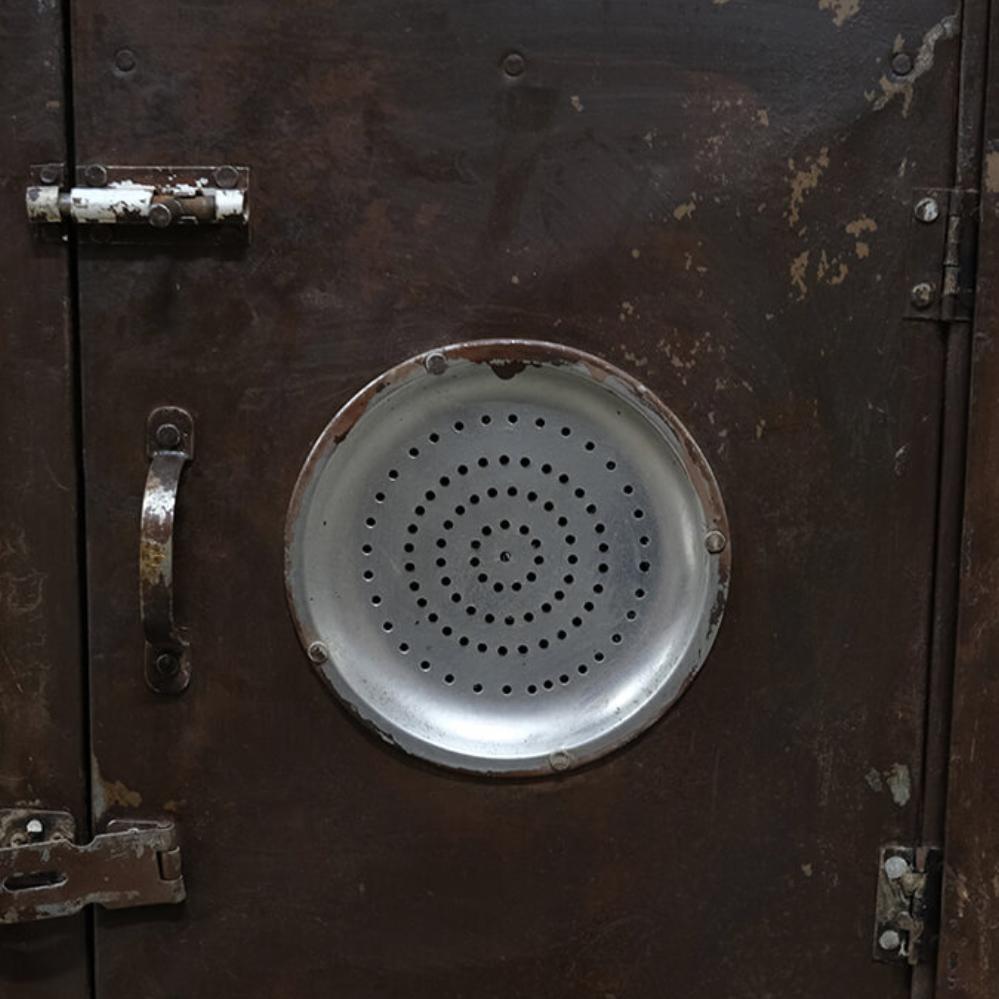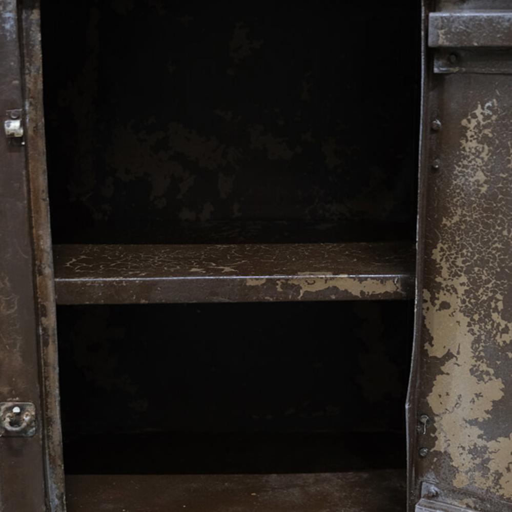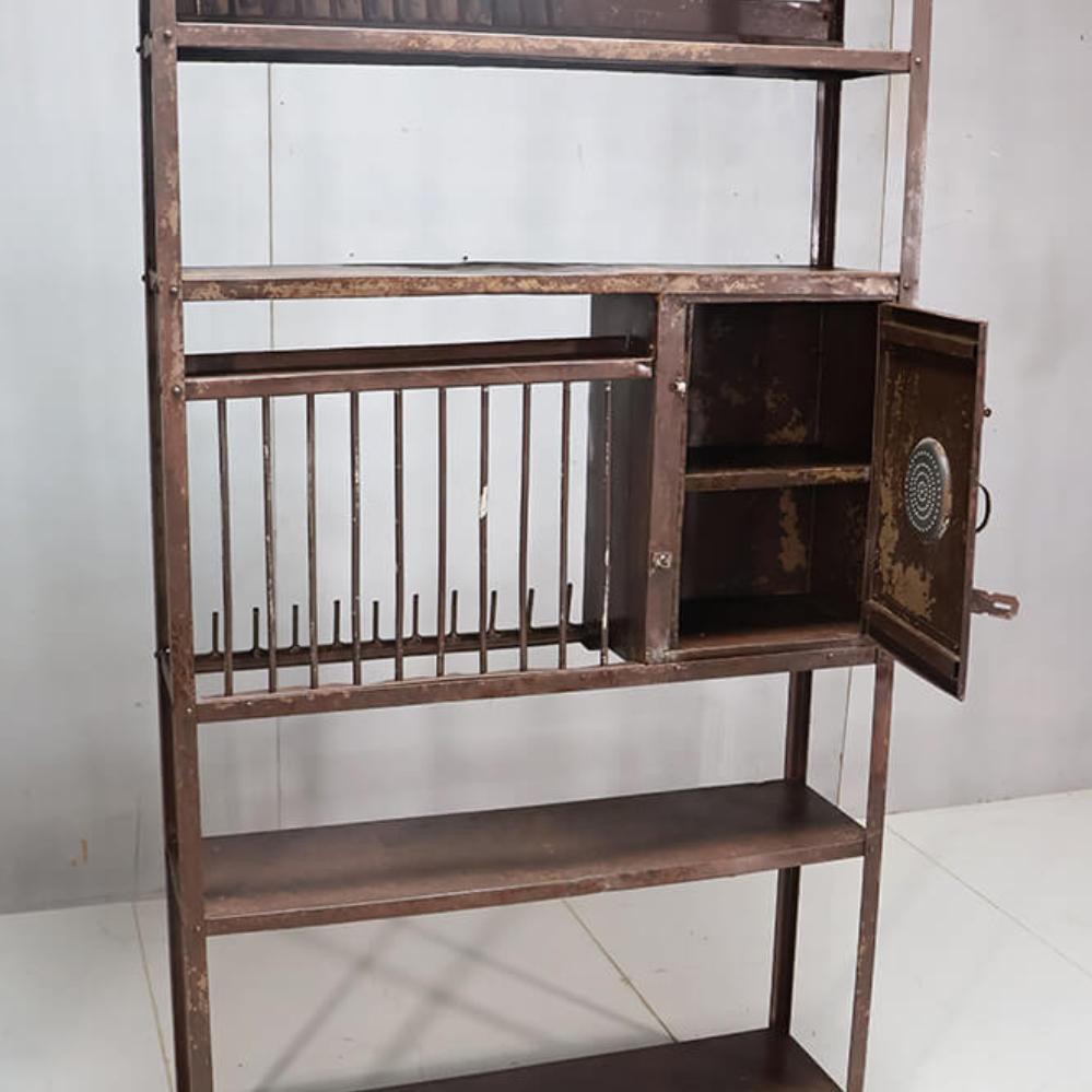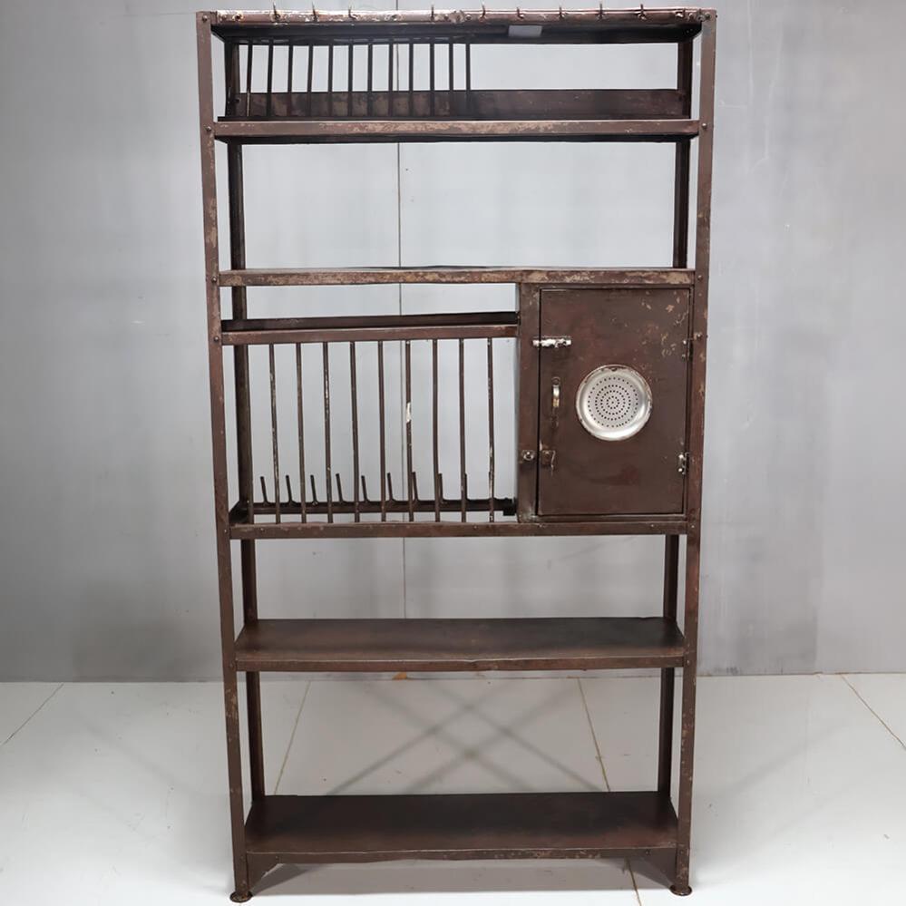 Dieses alte Regal aus Metall strahlt mit seinem patinierten Look rustikalen Charme aus. Es ist in drei Abschnitte mit offenen Fächern, einem Tellerhalter und einer Schranktür mit einem lustigen Belüftungsloch unterteilt. Der rohe und industrielle Ausdruck des Schranks macht es zu einem auffälligen Möbelstück in jedem Raum, wo es sowohl eine authentische Atmosphäre schaffen als auch praktische Aufbewahrung bieten kann. Perfekt für eine Küche mit rohem Stil oder um einer modernen Einrichtung einen industriellen Akzent zu verleihen.