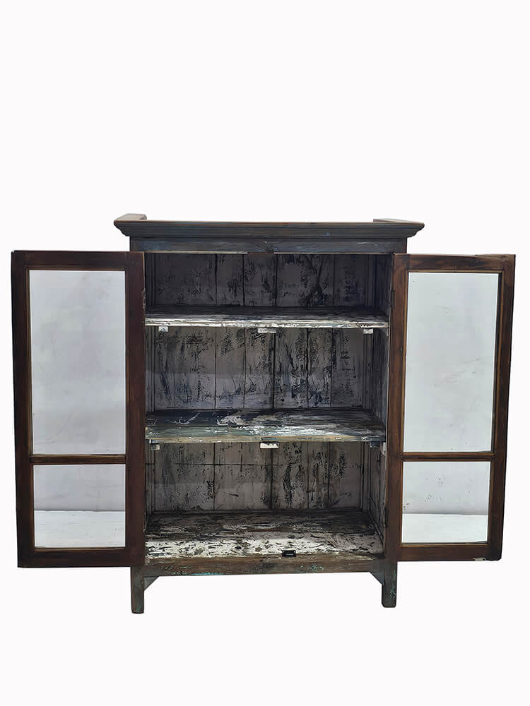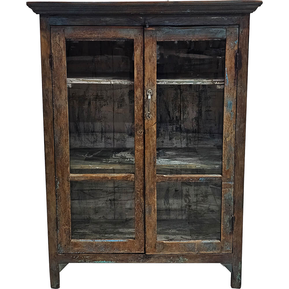 Diese schlichte Vitrine hat einen ruhigen und authentischen Ausdruck mit viel natürlichem Charme. Sie ist aus massivem Holz gefertigt und verfügt über eine schöne, rohe Oberfläche, bei der Spuren früherer Farbe und Abnutzung dem Möbelstück Charakter und Lebendigkeit verleihen. Die Vitrine besitzt zwei große Glastüren, die einen freien Blick auf den Inhalt ermöglichen und sie ideal für die Aufbewahrung und Präsentation von Porzellan, Glas oder dekorativen Objekten machen. Im Inneren sorgen Fächer für eine praktische und übersichtliche Aufteilung. Das schlichte Design und die klaren Linien sorgen dafür, dass die Vitrine sowohl in moderne, nordische als auch in rustikalere Einrichtungen passt. Ein funktionales und stimmungsvolles Möbelstück, das Stauraum mit einem ehrlichen und zeitlosen Ausdruck verbindet.