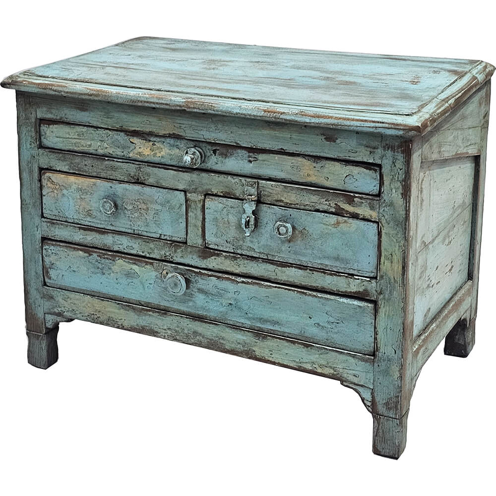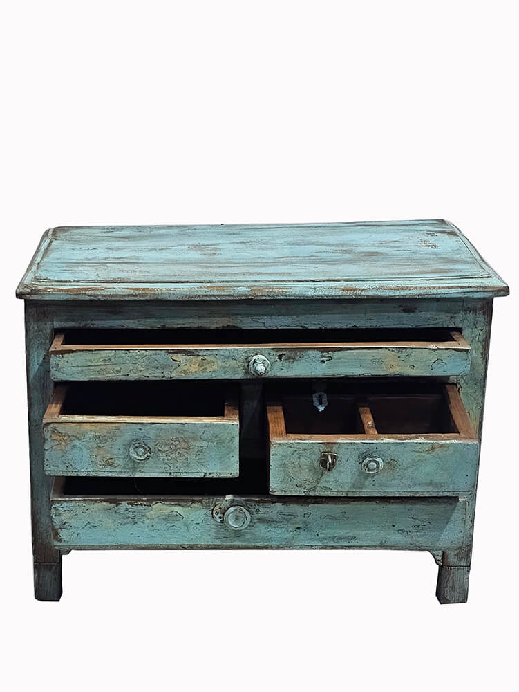 Diese kleine alte Kommode besitzt einen charmanten und lebendigen Ausdruck, bei dem die Spuren der Zeit deutlich sichtbar sind. Sie ist in einem grünlich-blauen Farbton gestrichen, der mit abgeblätterter Farbe, Abnutzung und feinen Farbwechseln schön patiniert ist und der Kommode Tiefe und Persönlichkeit verleiht. Die Oberfläche erzählt ihre eigene Geschichte und macht die Kommode zu einem Unikat. Die Kommode ist mit vier Schubladen in unterschiedlichen Größen ausgestattet und bietet praktische Aufbewahrungsmöglichkeiten für kleinere Gegenstände. Die originalen Griffe und das kleine Schloss in der Mitte unterstreichen den authentischen Charakter und tragen zum historischen Ausdruck des Möbels bei. Dank ihrer kompakten Größe lässt sie sich leicht platzieren und eignet sich perfekt als Nachttisch, im Eingangsbereich oder als dekoratives Aufbewahrungsmöbel im Wohnzimmer.