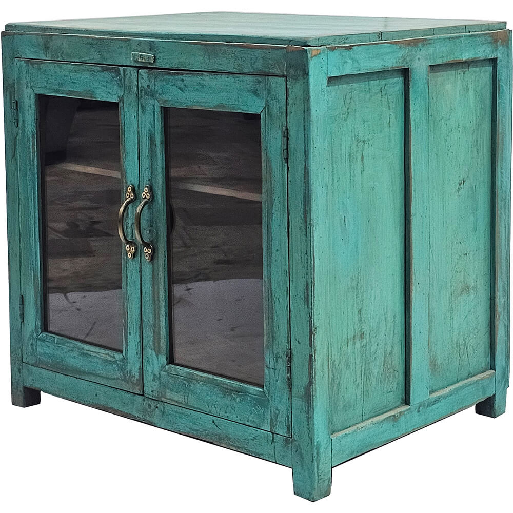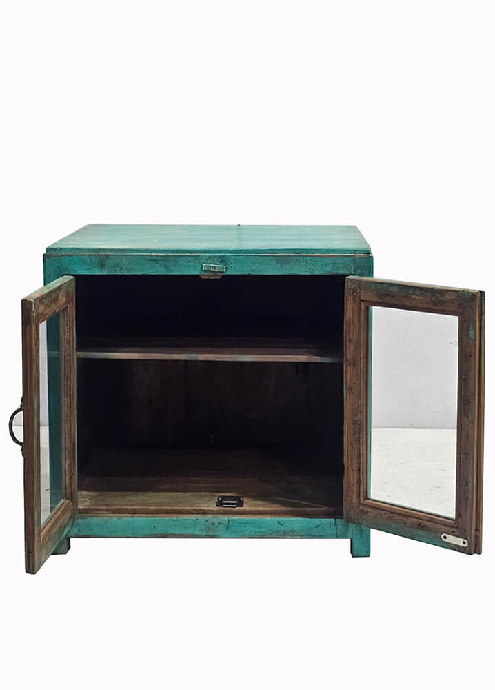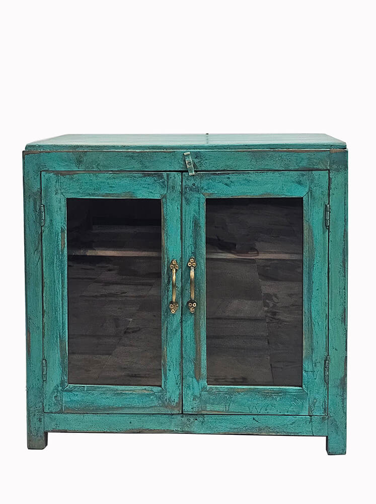 Dieser kleine grüne Schrank ist ein charmantes und funktionales Möbelstück mit viel Persönlichkeit. Die schöne grüne Farbe hat eine leicht patinierte Oberfläche, die dem Schrank einen authentischen und lebendigen Ausdruck verleiht. Die Holzstruktur und die feinen Gebrauchsspuren unterstreichen das Gefühl von Geschichte und handwerklicher Qualität. Die beiden Glastüren des Schranks mit feinen Griffen ermöglichen einen dezenten Blick auf den Inhalt und machen ihn sowohl für Aufbewahrung als auch für Präsentation ideal. Im Inneren befindet sich ein Fach, das ausreichend Platz für Gläser, Bücher, Porzellan oder kleine dekorative Objekte bietet. Dank seiner kompakten Größe lässt sich der Schrank leicht platzieren. Er eignet sich perfekt als Vitrinenschrank in der Küche, als Barschrank im Wohnzimmer oder als stimmungsvolle Aufbewahrung in einem Geschäft oder Café. Eine ideale Wahl für alle, die Wiederverwendung, Farbe und Möbel mit Charakter schätzen.
