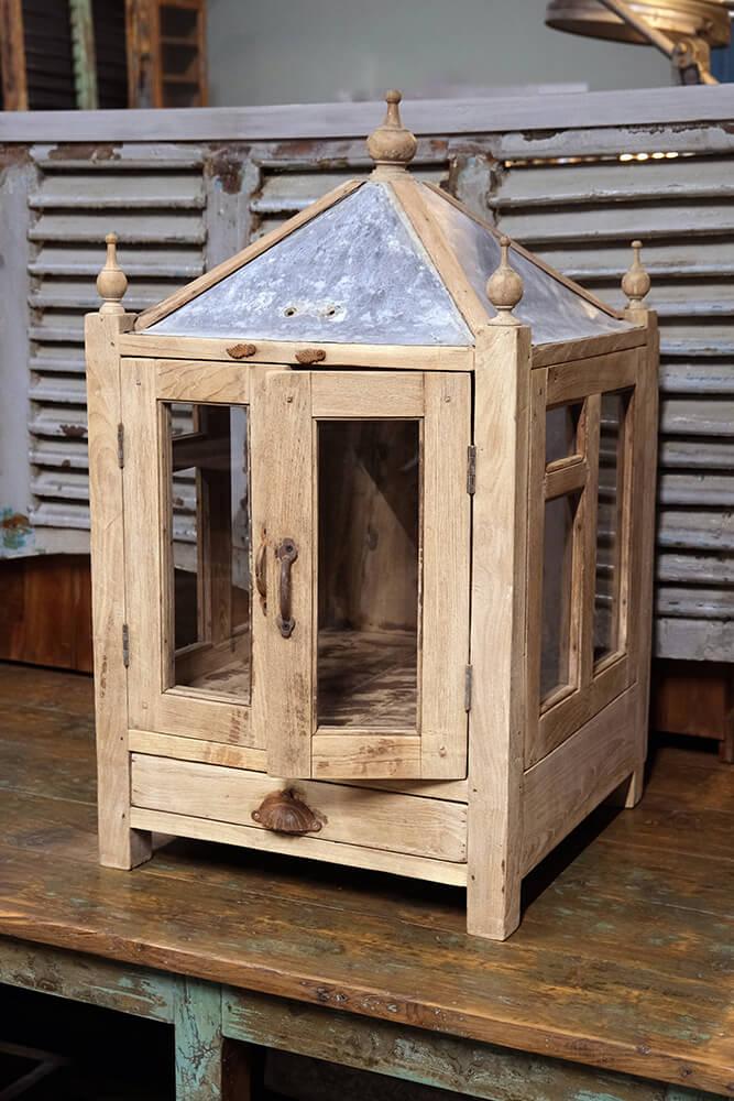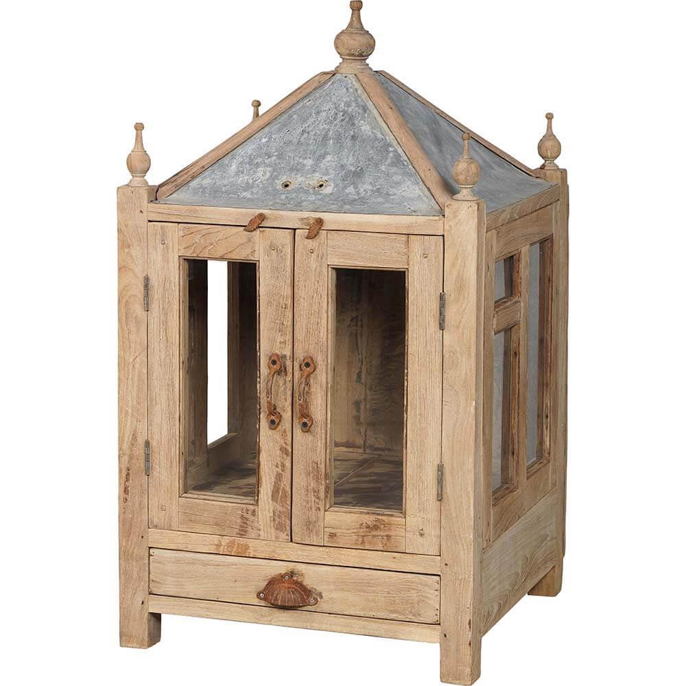 Dieses kleine Vitrinenschränkchen ist wie einen schönen Tempel gestaltet und kombiniert Holz mit einer Zinkdachkonstruktion. Mit seinen dekorativen Türmen und kleinen Glasfenstern strahlt es sowohl Charme als auch Charakter aus. Die eingebaute Schublade mit einem rustikalen Muschelgriff bietet zusätzlichen Stauraum, während die doppelt verglasten Türen perfekt sind, um kleine Schätze, Dekorationen oder Lichtelemente stilvoll zu präsentieren. Ideal für Ihr Zuhause oder Geschäfte, wo es als dekorativer Blickfang mit einem Hauch von Geschichte und Wärme dienen kann.