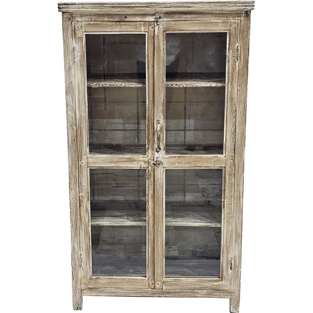 Wunderschöne, cremefarbige Vitrine aus Holz mit authentisch patinierter Oberfläche, die dem Möbelstück einen rustikalen und zeitlosen Ausdruck verleiht. Der Schrank verfügt über zwei große Glastüren und geräumige Fächer, wodurch er sich ideal zur Aufbewahrung und Präsentation von Geschirr, Gläsern oder dekorativen Gegenständen eignet. Die Vitrine hat drei Seiten mit Metallplatten, die ihr eine industrielle Note und einen spannenden Kontrast zu der hellen, abgenutzten Oberfläche verleihen. Die Kombination aus Holz, Glas und Metall schafft ein ausdrucksstarkes Möbelstück mit robuster Ausstrahlung. Perfekt für alle, die ein Möbel mit Charakter und Geschichte suchen, ganz gleich, wo es steht.