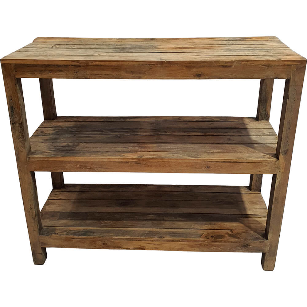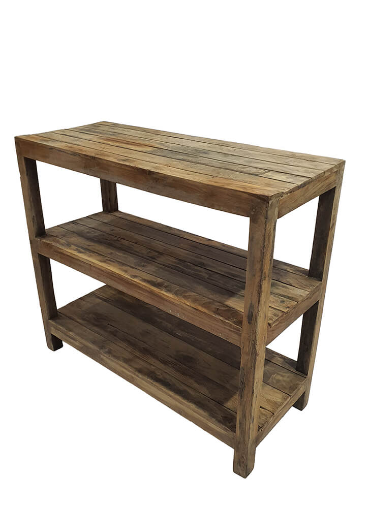 Dieses niedrige Holzregal ist ein schlichtes und praktisches Möbelstück mit viel Wärme und Charakter. Es besteht aus solidem Holz, dessen Maserungen und natürliche Spuren einen authentischen, rustikalen Ausdruck verleihen. Das Regal verfügt über drei geräumige Böden und eignet sich ideal für die Aufbewahrung im Eingangsbereich oder in der Küche sowie für Dekoration im Wohnzimmer oder Geschäft. Die offene Konstruktion sorgt für einen leichten und ruhigen Ausdruck und bietet zugleich viel Platz für Körbe, Keramik, Bücher oder Pflanzen. Ein vielseitiges Möbelstück, das sich leicht platzieren lässt und jedem Raum ein natürliches, warmes Element hinzufügt.