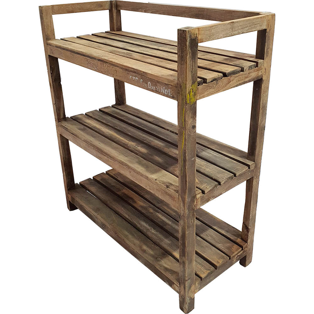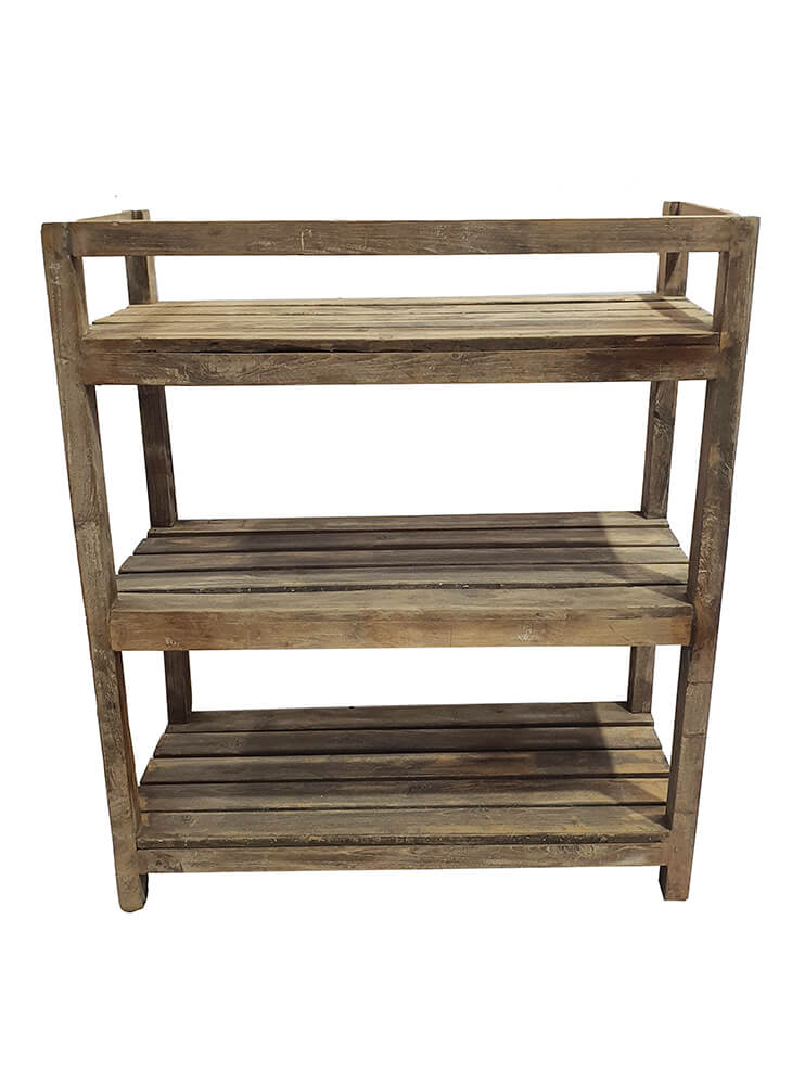 Dieses alte Holzregal mit drei Lamellenböden hat einen rohen und ehrlichen Ausdruck, der jedem Raum viel Persönlichkeit verleiht. Es besteht aus Holz mit Patina, Gebrauchsspuren und kleinen Farbresten, die seine eigene Geschichte erzählen. Perfekt für alle, die Möbel mit Seele lieben. Das Regal wirkt leicht und offen und ist zugleich sehr praktisch. Die drei Böden bieten viel Platz für die Aufbewahrung von Schuhen, Körben, Pflanzen, Geschirr oder Waren, die Sie gerne präsentieren möchten. Ein flexibles Möbelstück, das im Eingangsbereich, in der Küche, im Wohnzimmer oder als Display im Geschäft gleichermaßen gut funktioniert. Eine schöne Kombination aus Funktionalität und authentischem Charme.