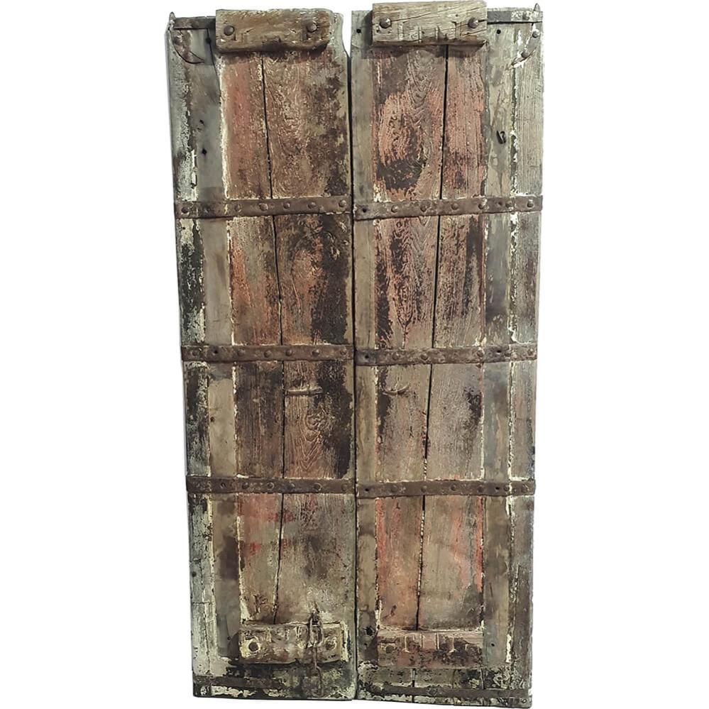 Diese massive alte Holztür zeigt stolz, woher sie kommt. Deutliche Spuren von Abnutzung, Witterung und jahrzehntelangem Gebrauch machen sie zu einem Zeugnis solider Handwerkskunst und echter Patina. Die Tür besteht aus senkrechten Brettern, die von waagerechten und diagonalen Holzstreben sowie kräftigen Metallbeschlägen mit Nieten zusammengehalten werden. Grobe Eisenverschlüsse und Scharniere unterstreichen den rohen, authentischen Ausdruck – fast so, als wolle die Tür ihre Geschichte erzählen. Kein Schnickschnack, nur ehrliche Konstruktion und rustikales Holz in Braun-, Rot- und Grautönen. Ideal als dekoratives Wandpaneel, als Hintergrund in einem Laden oder als Blickfang in einem Zuhause, in dem das Rustikale im Mittelpunkt stehen darf. Eine Tür mit Charakter – genau, wie wir es mögen.