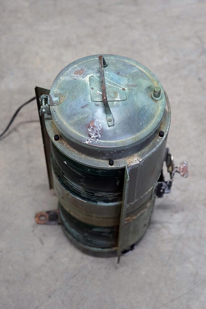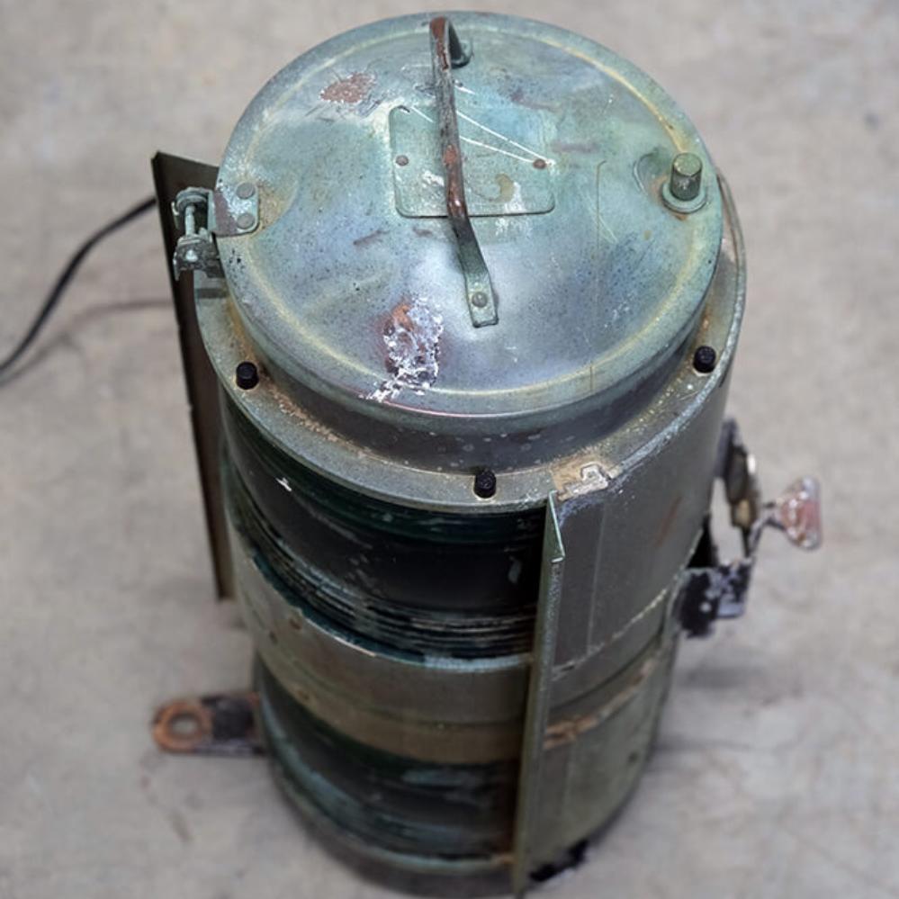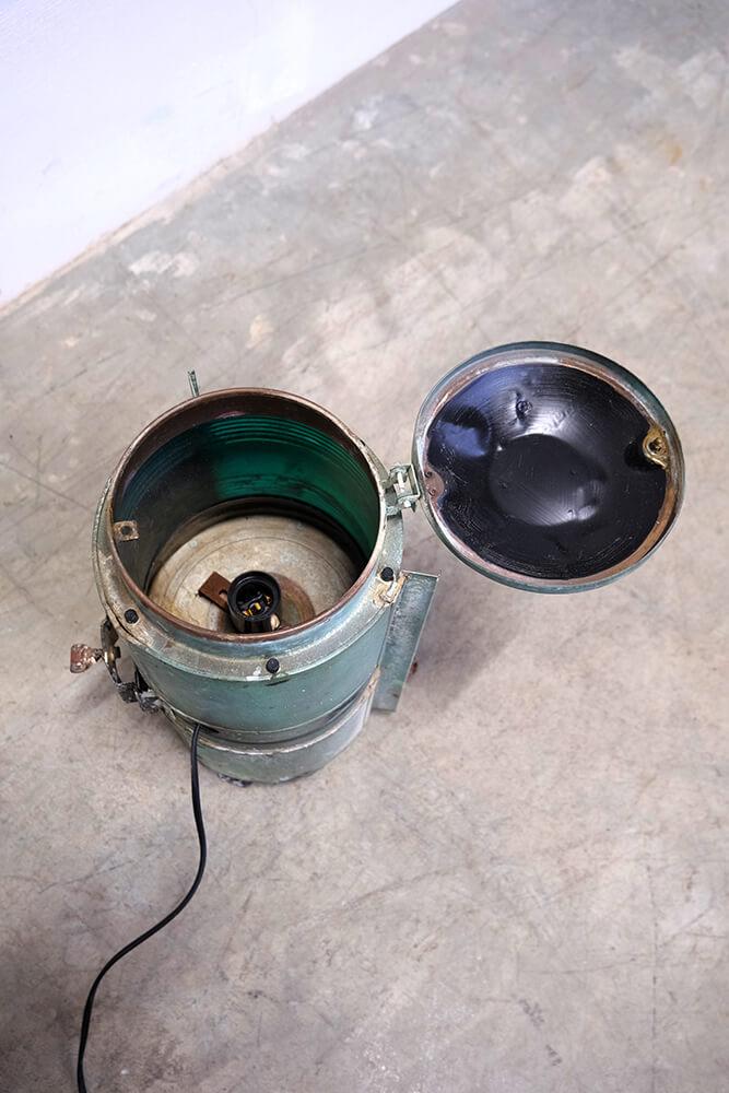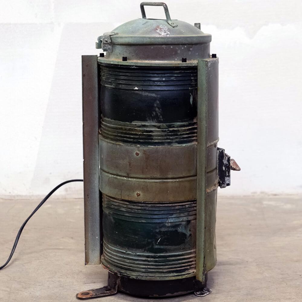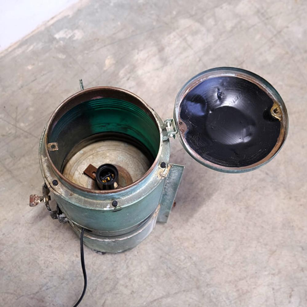 Diese authentische Schiffsleuchte aus grünspanigem Messing strahlt rustikalen und nostalgischen Charme aus, der ihre maritime Herkunft widerspiegelt. Die Leuchte hat eine schöne Patina mit ihrer abgenutzten, grünlichen Oberfläche, die nur die Zeit erschaffen kann. Die runde Form mit Deckel oben und robuster Basis zeugt von einer stabilen Konstruktion, die rauen Wetterbedingungen auf alten Schiffen standhalten konnte. Die Lampe ist elektrifiziert und bereit für den Einsatz in Ihrem Zuhause oder Restaurant. Ein auffälliges Detail ist der Scharnierdeckel, der sowohl ein authentisches Erscheinungsbild verleiht als auch praktisch ist. Sie steht fest auf ihren montierten Füßen, und der alte Kabelausgang zeigt, dass diese Lampe einst auf einem Schiff hing, wo sie Licht in die Dunkelheit brachte.