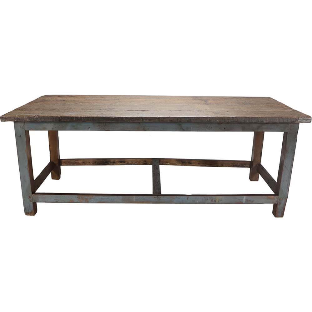 Dieser Langtisch hat eine rustikale Patina, die seinen authentischen Charakter unterstreicht. Die Holzbretter, die die Tischplatte bilden, sind mit Gebrauchsspuren und anderen rohen Details bedeckt, die dem Tisch einen maskulinen Charme verleihen. Der Tisch ist ideal als kreativer Arbeitsplatz, stylischer Verkaufstisch oder Serviertisch. Der Used-Look verleiht dem Tisch ein entspanntes Gefühl, das sich perfekt für eine lässige, aber stilbewusste Einrichtung eignet. Der Langtisch ist mit Wachs behandelt.