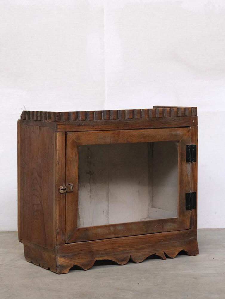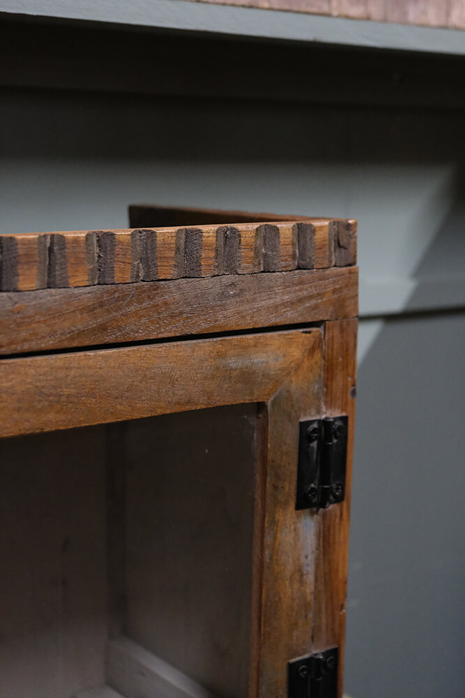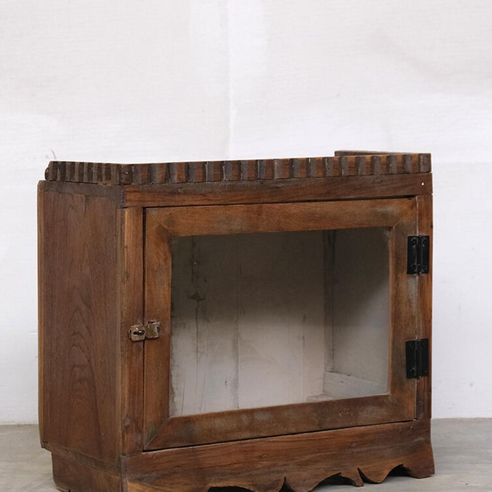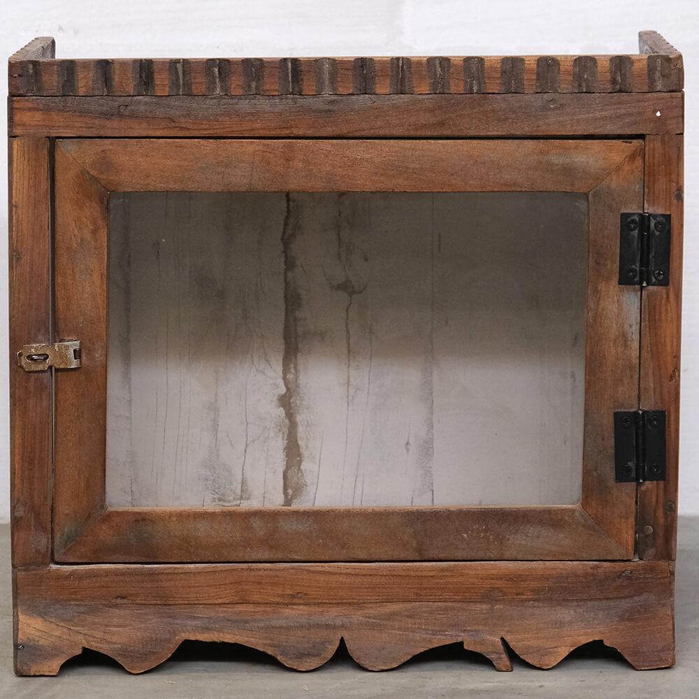 Lassen Sie diesen Wandschrank in Ihrem Zuhause Platz finden und fügen Sie einen Hauch rustikaler Charme hinzu. Die Glastür bietet Einblick in alles, was Sie darin aufbewahren möchten. Die Patina des Schrankes verleiht der Atmosphäre eine Vintage-Vibe und kann in viele verschiedene Einrichtungsstile integriert werden.