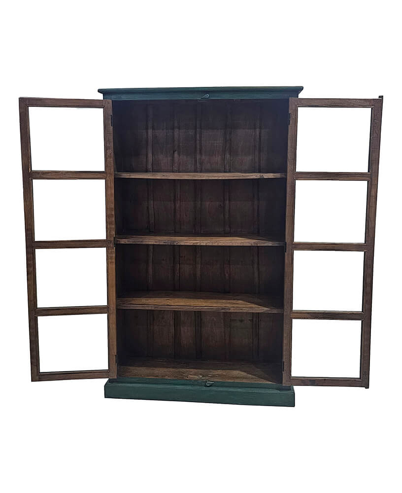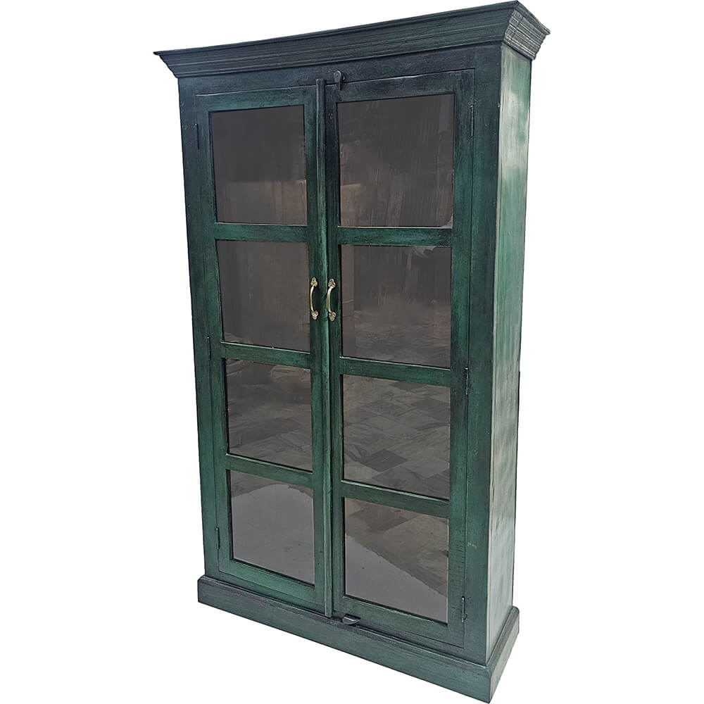 Eine wunderschöne grüne Vitrine aus Holz mit einem klassischen und eleganten Ausdruck. Der Schrank verfügt über zwei große Glastüren, die ihm ein leichtes und offenes Erscheinungsbild verleihen und ihn ideal zur Aufbewahrung und Präsentation von Geschirr, Gläsern oder dekorativen Gegenständen machen. Die tiefgrüne Farbe mit leicht patinierter Oberfläche verleiht der Vitrine Charakter und macht sie zu einem markanten Element in der Einrichtung. Die schlichten Linien in Kombination mit den feinen Griffen schaffen ein harmonisches Gleichgewicht zwischen rustikalem Charme und zeitloser Stil. Ein vielseitiges Möbelstück, das sowohl im Zuhause, im Café als auch im Restaurant perfekt zur Geltung kommt. Der Schrank bringt Wärme, Farbe und Persönlichkeit in den Raum.
