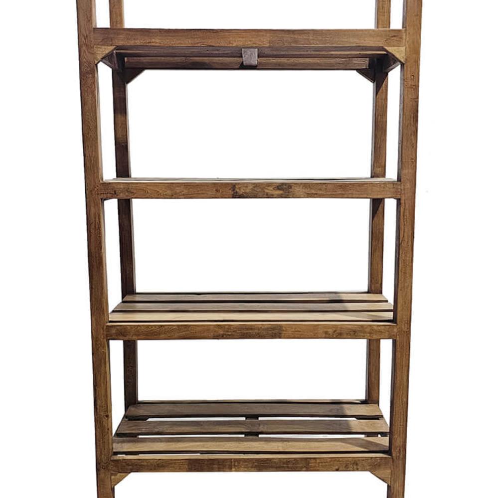 Dieses Holzregal ist nicht neu. Und genau das macht es so besonders. Es ist aus massivem Teakholz gefertigt und zeigt sich in seinem Originalzustand; gebraucht, ehrlich und voller Leben. Mit seinem klassischen, schlichten Design und den Lamellenböden aus schön patiniertem Holz vereint es Funktion und Charakter. Das Regal hat bereits ein Arbeitsleben hinter sich. Das zeigen die kleinen Spuren und Variationen im Holz. Hier bekommen Sie ein Stück Möbelgeschichte mit Charakter und Wärme, nichts Fabrikneues oder Hochglanzpoliertes. Ideal als Präsentationsregal im Laden, zur Aufbewahrung in der Küche oder als rustikales Element im Café. Ein Teakregal mit dem gewissen Etwas, Authentizität und einer Vergangenheit, die auch heute noch Sinn ergibt.