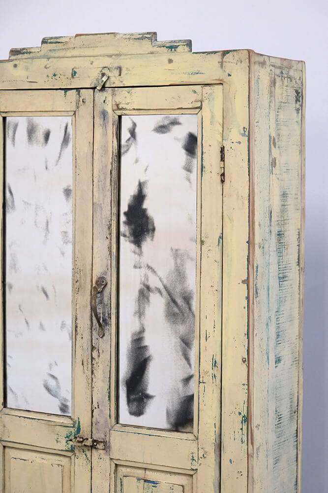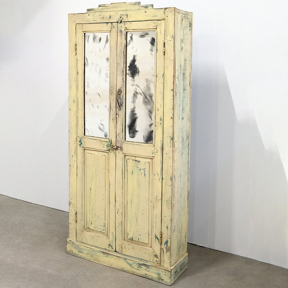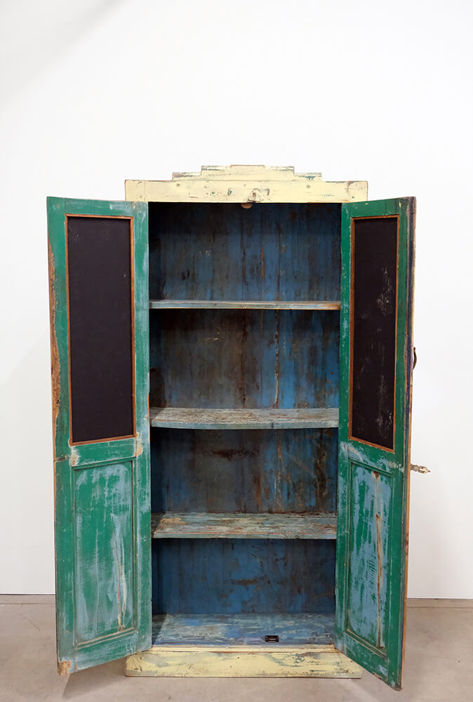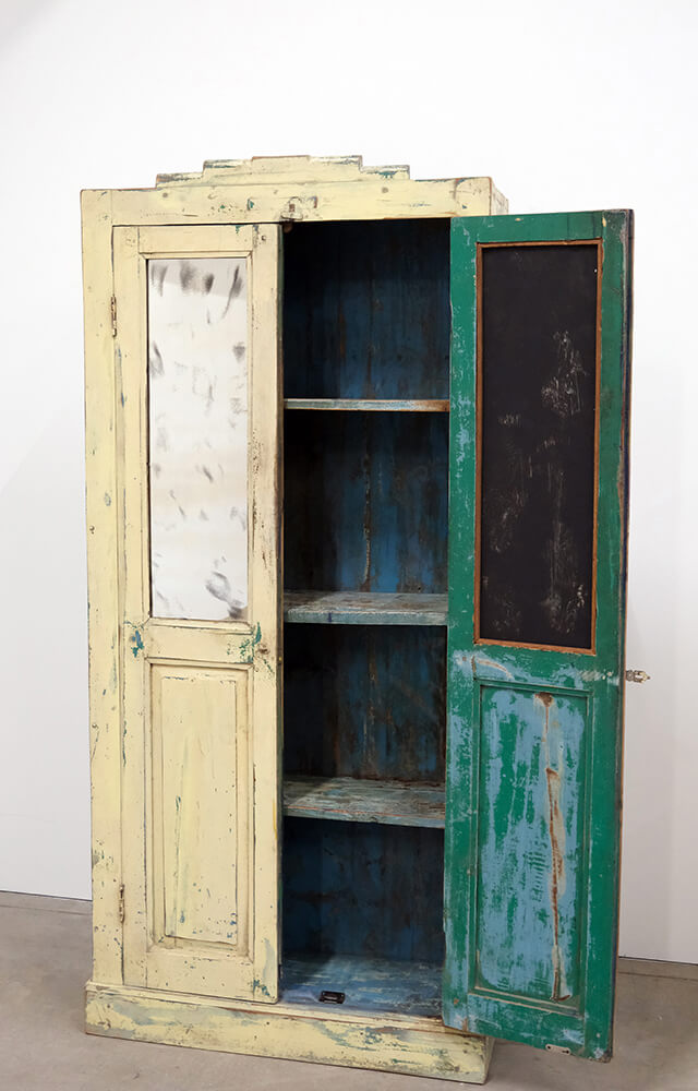 Dieser Schrank ist ein wenig wie eine alte Persönlichkeit mit vielen Seiten. Von außen wirkt er ruhig, staubig gelb mit abgeblätterter Farbe und Spuren seines gelebten Lebens. Doch öffnet man die Türen, verändert sich etwas. Das tiefblaue Innere und die grünen Töne auf der Rückseite der Türen verleihen ihm einen ganz anderen Ausdruck. Ein wenig unerwartet. Ein wenig eigenwillig. Ziemlich charmant. Auch die Spiegel in den Türen sind nicht perfekt. Sie sind leicht verschwommen und lebendig in der Oberfläche, sodass man nicht nur ein Spiegelbild bekommt, sondern eine besondere Stimmung. Dadurch wirkt der Schrank weniger klassisch „perfekt“, aber deutlich interessanter. Im Inneren befinden sich Regalböden mit viel Stauraum. Praktisch, ja, aber es sind die Kontraste, die hier den Unterschied machen. Hell und dunkel, abgenutzt und überraschend. Ein Schrank, der sich nicht ganz festlegen will. Und genau deshalb funktioniert er.