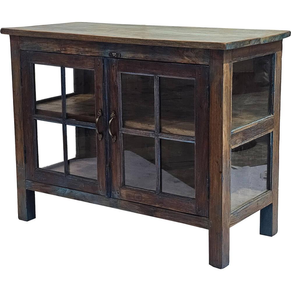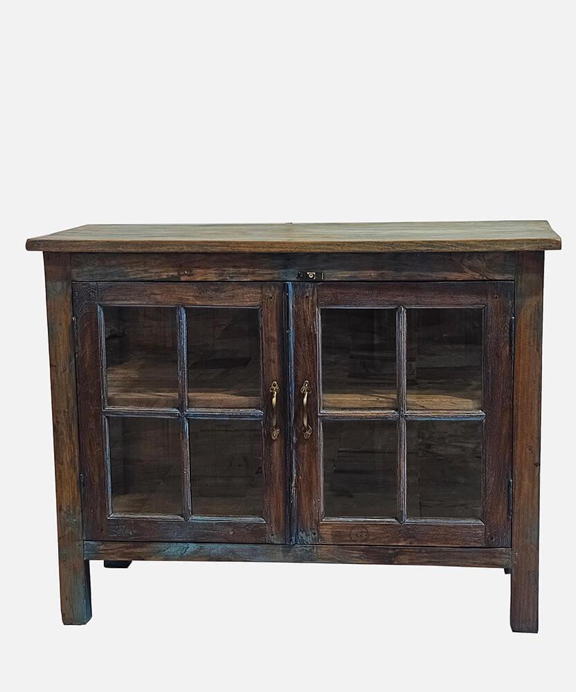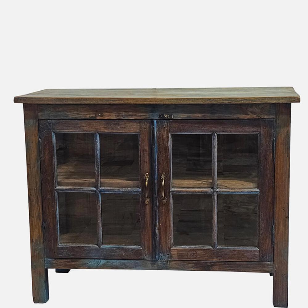 Diese wunderschöne Anrichte ist eine rohe, rustikale und klassische Ergänzung für jeden Raum. Mit Glas an den Seiten und in den Türen versteckt sie nichts – sie zeigt ihren Inhalt mit Stolz. Gefertigt aus Holz mit sichtbarer Maserung und einem dunklen, warmen Farbton, strahlt sie Handwerkskunst und Authentizität aus. Die drei Glasflächen verleihen dem Sideboard eine gewisse Leichtigkeit, die einen schönen Kontrast zum massiven Holz und den rustikalen Details bildet. Nutzen Sie die Anrichte als Vitrine in einem Café, Restaurant oder Laden, um Ihre Lieblingsprodukte, Flaschen oder Dekoelemente stilvoll zu präsentieren. Auch im Zuhause macht sie sich hervorragend – als Aufbewahrungsmöbel mit Charakter, sei es in der Küche, im Esszimmer oder im Flur.
