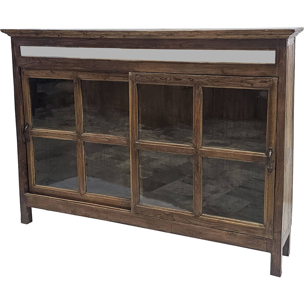 Wunderschönes und geräumiges Sideboard aus Holz mit einem schlichten und funktionalen Design. Die großen Glastüren lassen sich seitlich verschieben, was den Zugang zum Inhalt erleichtert und gleichzeitig einen schönen Blick auf das bietet, was Sie ausstellen möchten. Ein dekoratives Spiegelelement im oberen Bereich verleiht dem Möbelstück Leichtigkeit und reflektiert das Licht auf dezente Weise. Das massive Holz und die harmonischen Proportionen sorgen für einen zeitlosen Look, der perfekt in Restaurants, Geschäfte oder private Wohnräume passt. Ein Möbelstück, das Funktionalität und Ästhetik vereint und Ihrer Einrichtung Wärme und Charakter verleiht.