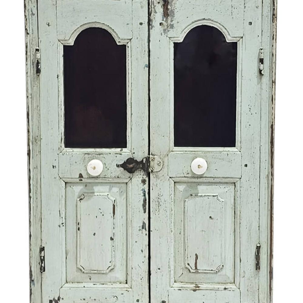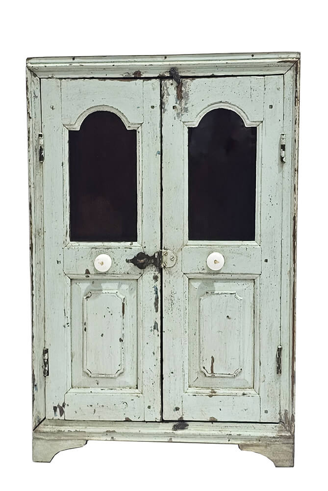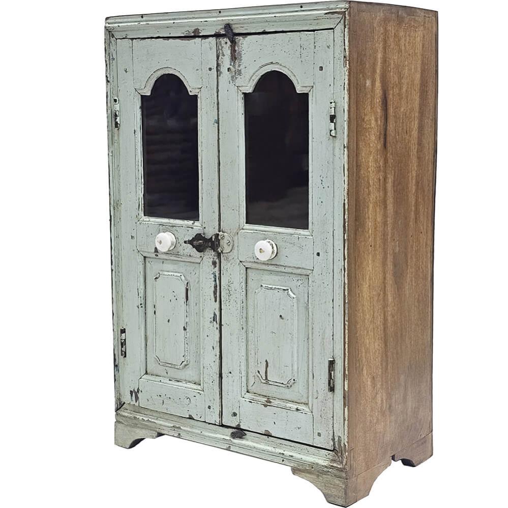 Dieser wunderschöne Vitrinenschrank ist ein einzigartiges Möbelstück mit viel Charakter und Geschichte. Er ist aus Holz gefertigt und verfügt über zwei kunstvoll geschnitzte Türen mit Glasfeldern, die ihm ein leichtes und elegantes Erscheinungsbild verleihen. Die hübsche grüne Patina mit natürlichen Gebrauchsspuren unterstreicht das authentische Aussehen und verleiht dem Schrank einen rustikalen, zeitlosen Charme. Dekorative Porzellangriffe und ein klassischer Verschlussmechanismus bringen ein Gefühl von Handwerkskunst und Nostalgie. Verwenden Sie die Vitrine, um Porzellan, Glas oder Ihre Lieblingsstücke zu präsentieren und eine warme, einladende Atmosphäre zu schaffen.
