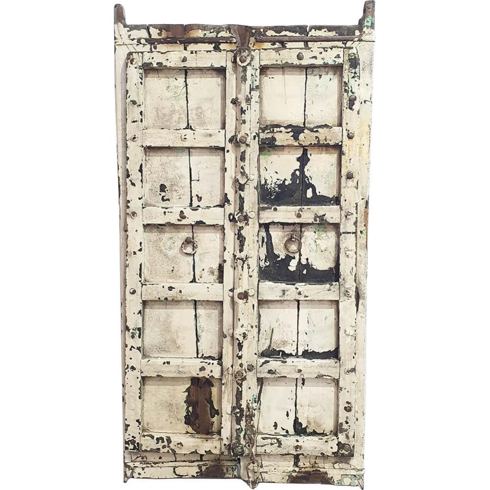 Diese weiße, alte Holztür ist ein echter Schatz für alle, die Möbel und Interieur mit Geschichte und Charakter lieben. Die Tür zeigt deutliche Spuren von Abnutzung und Gebrauch, die ihren Charme nur noch verstärken. Die Farbe ist an mehreren Stellen abgeplatzt und gibt Schichten früherer Farben frei – all das verleiht der Tür eine wunderbar lebendige Patina. Kleine Eisenringe, dekorative Beschläge und markante Holzrahmen erzählen die Geschichte eines Handwerksstücks, das einst sowohl funktional als auch bedeutungsvoll war. Heute kann die Tür als einzigartige Wanddekoration, als Hintergrund in einem Geschäft, als Blickfang im Eingangsbereich oder als kreativer Raumteiler genutzt werden – oder einfach als das, was sie ist: eine Tür mit viel Persönlichkeit. Jeder Kratzer und jede Absplitterung ist ein Kapitel ihrer Geschichte. Bereit, das nächste mit Ihnen zu schreiben.