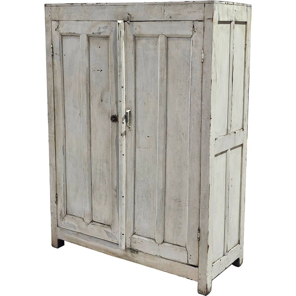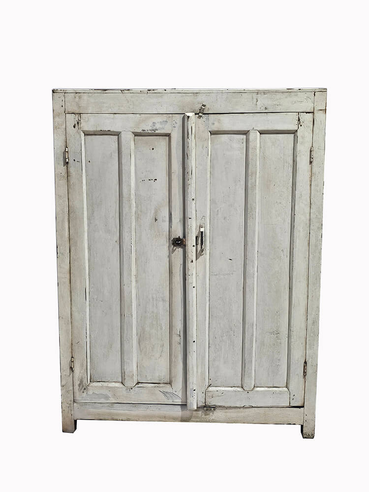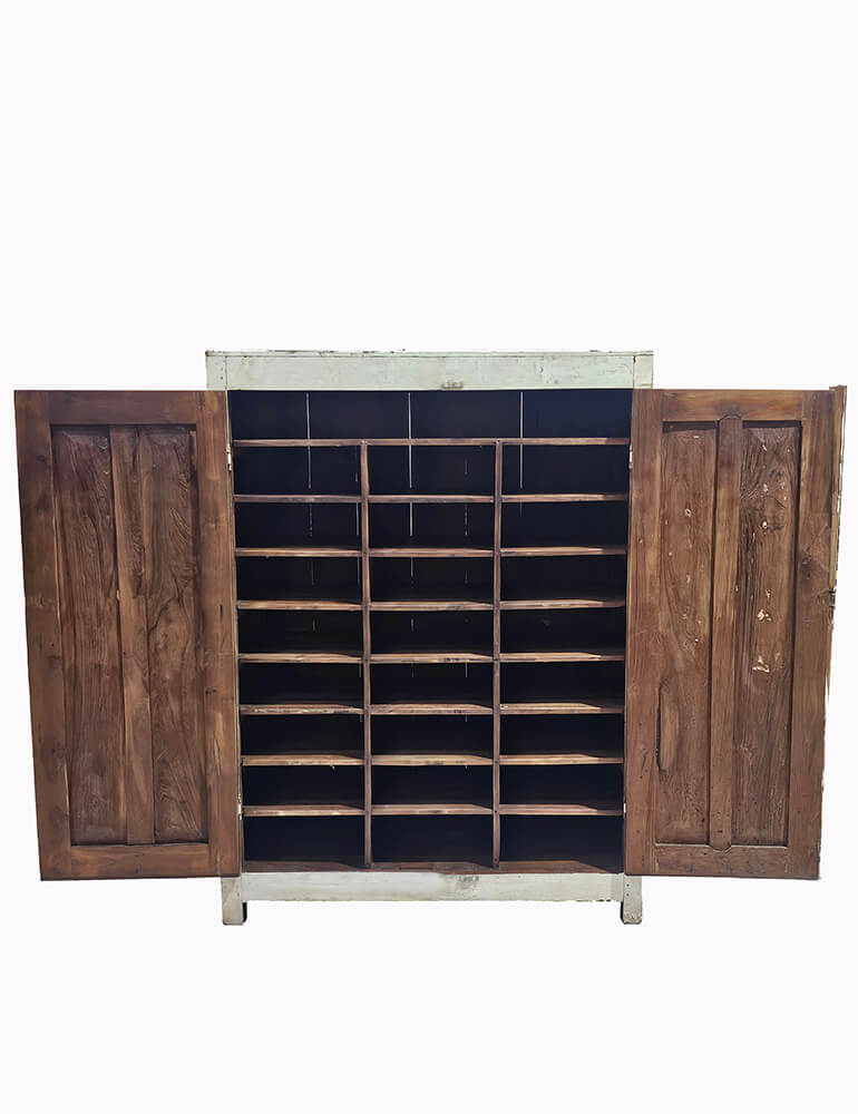 Dieser Holzschrank mit zwei Türen ist ein ganz besonderes Möbelstück, das Charakter und Funktionalität vereint. Außen zeigt der Schrank eine helle, patinierte Oberfläche mit deutlichen Spuren von Alter und Gebrauch, die für einen ruhigen und authentischen Ausdruck sorgen. Die gedämpfte, weiße Farbe harmoniert schön mit den schlichten Füllungstüren und dem soliden, klassischen Design. Beim Öffnen der Türen offenbart sich ein praktisches und dekoratives Inneres mit insgesamt 24 Fächern. Die vielen kleinen Fächer machen den Schrank ideal für Organisierung und Aufbewahrung, perfekt für Keramik, Glas, Kleinteile, Sammlungen oder kreative Projekte. Das dunklere Holz im Inneren bildet einen schönen Kontrast zur hellen Außenseite und betont die Struktur der Fächer. Der Schrank funktioniert sowohl als funktionales Aufbewahrungsmöbel als auch als markantes Element in der Einrichtung. Eine ideale Wahl für alle, die einzigartige Möbel mit Geschichte, Patina und vielseitigen Einsatzmöglichkeiten schätzen.