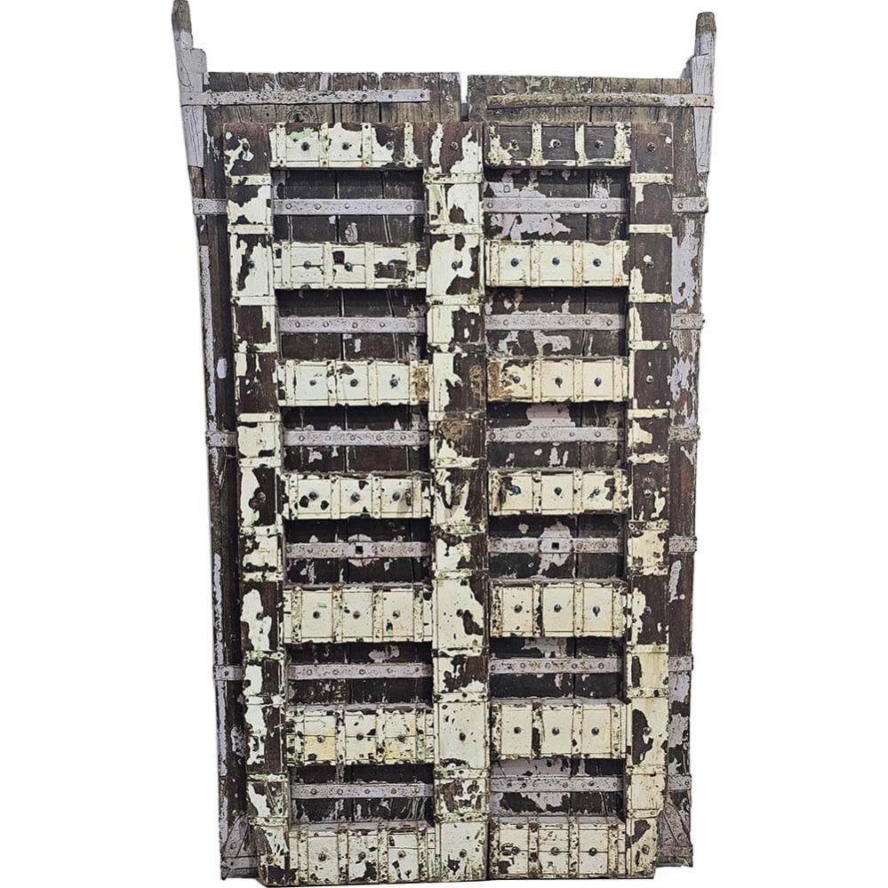 Diese patinierte Holztür ist einen echten Blickfang mit viel Charme und Geschichte. Die rustikale Oberfläche zeigt die Spuren der Zeit, wobei abblätternde Farbschichten die natürliche Holzstruktur darunter freilegen. Die massiven Eisenverstärkungen, dekorativen Nieten und Scharniere unterstreichen den robusten, industriellen Charakter der Tür, während die zarten Nuancen heller und dunkler Farben einen wunderschönen Kontrast schaffen. Perfekt als rustikale Wanddekoration, einzigartige Raumtrennung oder stimmungsvolle Eingangstür, die jeder Einrichtung authentischen Vintage-Charme verleiht.