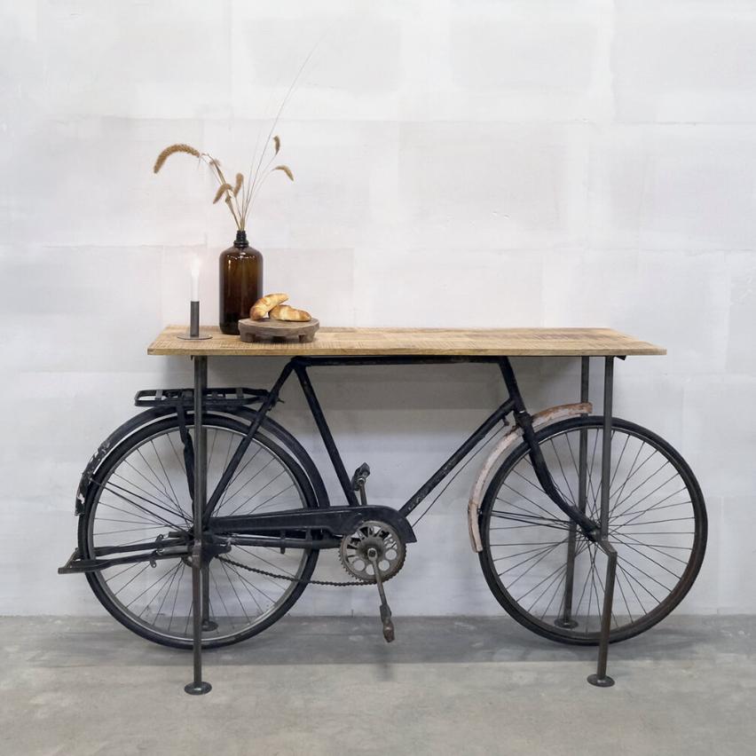 Einst sprintete dieses Fahrrad durch die Straßen der Stadt. Jetzt dient das Gestell als Basis für eine rustikale Holzplatte, in einer Mischung aus maskulinem Design und rustikalem Charme.