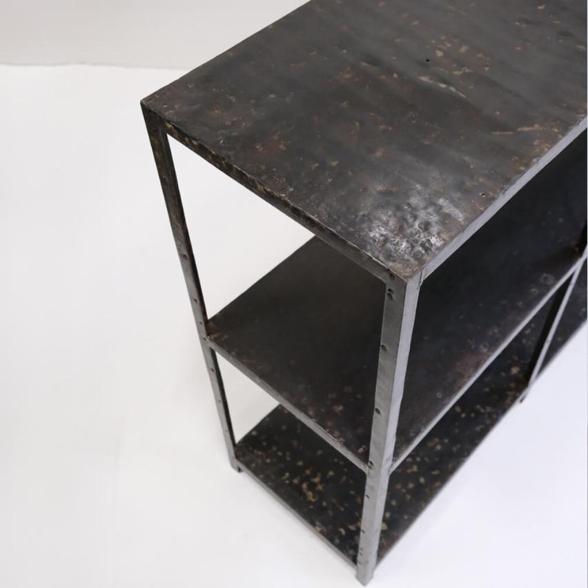 Die Tischplatten, die die Oberfläche des Tisches bilden, bestehen aus recycelten Schwerlastmatten. Dieser upcycelte Charakter verleiht dem Beistelltisch eine authentische und rustikale Dimension und macht jedes Exemplar einzigartig.