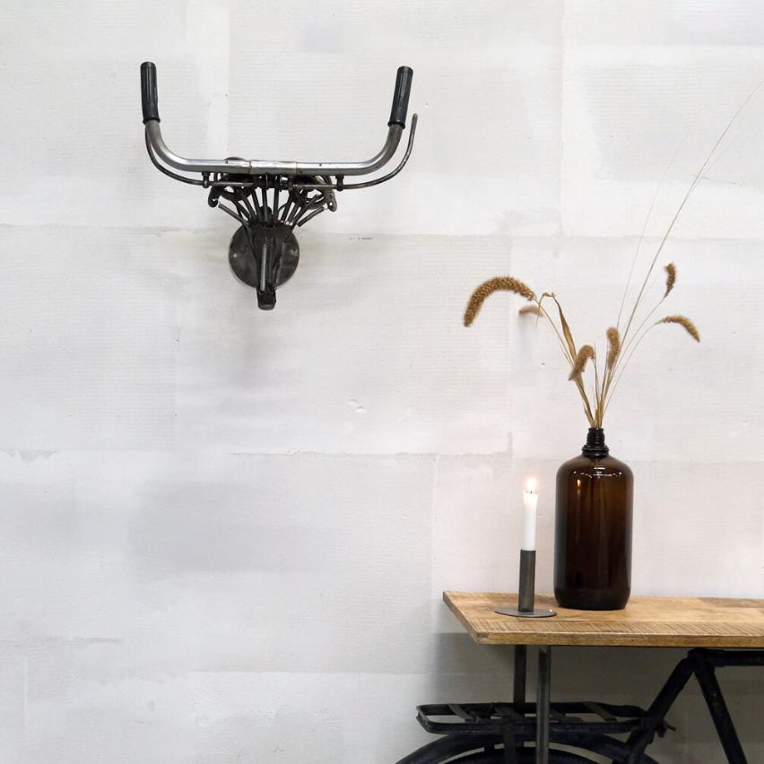 Das Fahrradgeweih ist eine moderne Interpretation der klassischen Jagdtrophäe. An der Wand aufgehängt erinnert der alte Fahrradlenker zum Verwechseln an das elegante Geweih des Hirsches. Die Verschmelzung von natürlichen und urbanen Elementen macht das „Geweih“ zu einer lustigen und besonderen Ergänzung für die moderne Einrichtung.