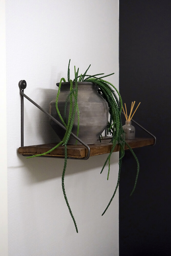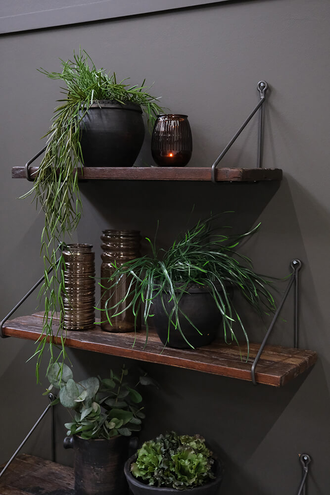 Ein rohes und schlichtes Regal, das die Authentizität der Natur mit einem Hauch industriellen Designs verbindet. Die Regalplatte ist aus Altholz gefertigt, bei dem Maserung, Patina und kleine Unebenheiten seine Geschichte erzählen. Getragen wird sie von zwei Eisenhaltern, die einen leichten und grafischen Ausdruck verleihen und gleichzeitig den rustikalen Charakter des Regals unterstreichen. Dieses Regal eignet sich perfekt zur Präsentation von Krügen und Gläsern, kleinen dekorativen Fundstücken oder grünen Pflanzen. Jedes Regal ist in seinem Ausdruck einzigartig, und genau das macht es zu einem ganz besonderen Detail in privaten Wohnräumen ebenso wie in Café- oder Ladeneinrichtungen. Das Regal ist in drei Größen erhältlich.