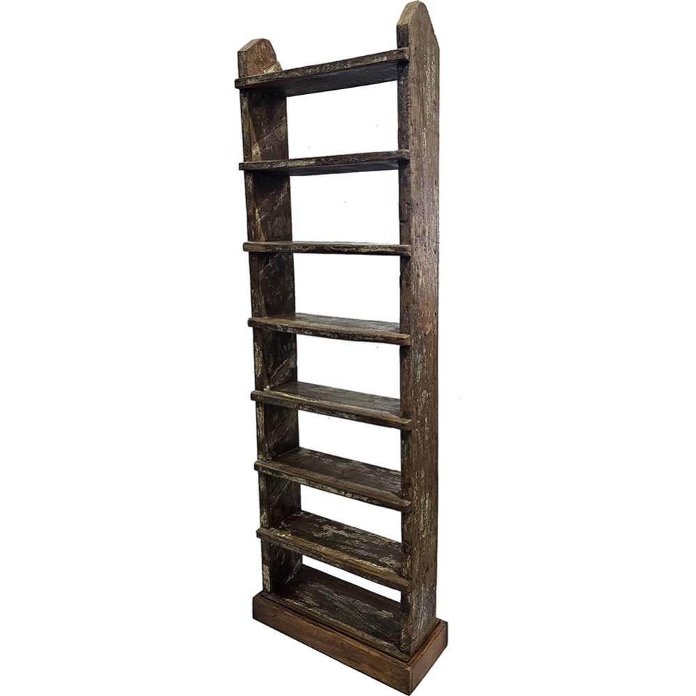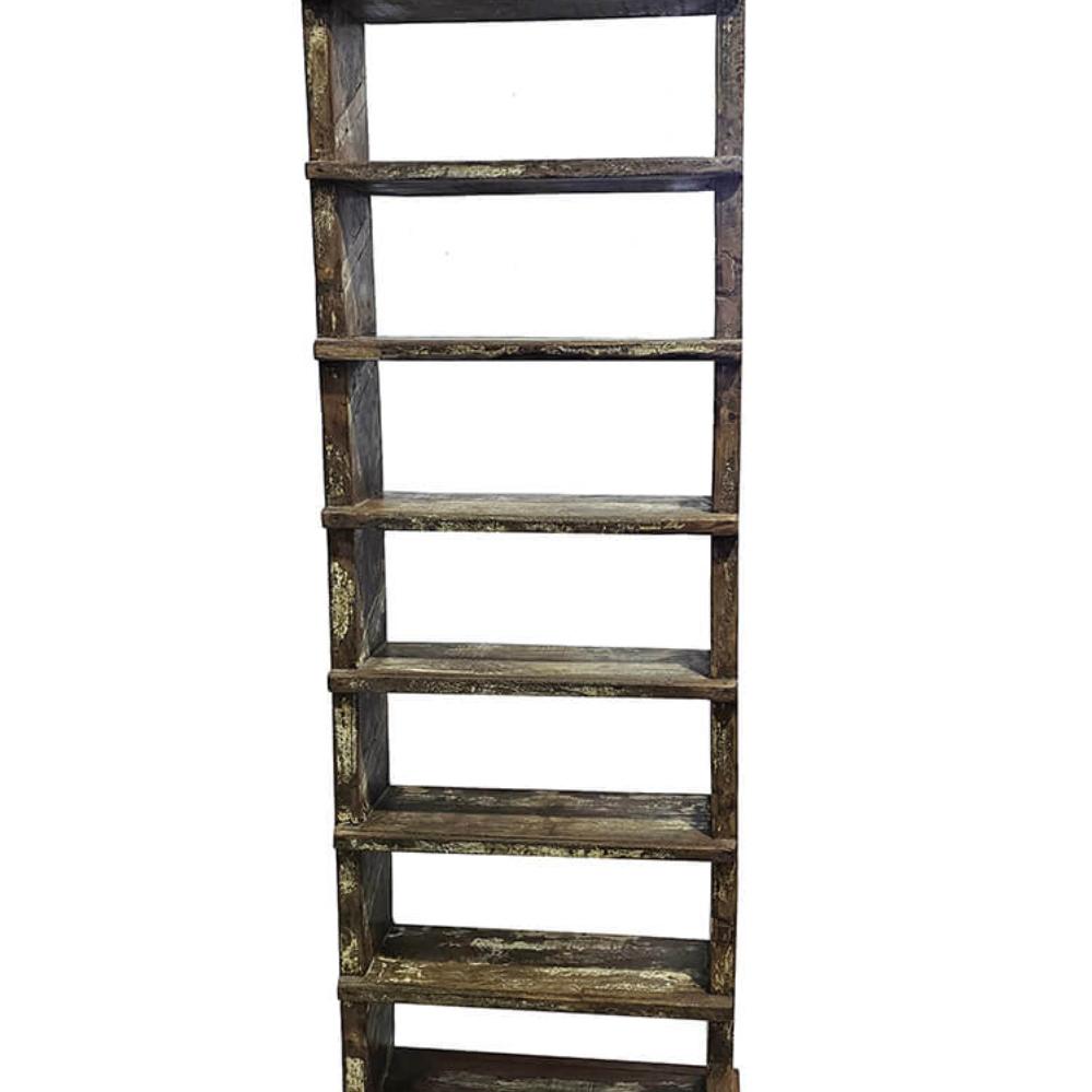 Hier finden Sie ein hohes, schlankes und charaktervolles Regal, das früher einmal als Treppe in Indien diente. Jetzt präsentiert es sich als Regal mit sieben praktischen Ablageflächen und einer ordentlichen Portion Patina. Das Regal ist aus massivem Holz gefertigt und besitzt eine schöne dunkle Oberfläche mit Gebrauchsspuren, Farbspritzern und Abnutzung – all das verleiht ihm seinen rauen Charme. Dank des stabilen Sockels steht es sicher, und die Abstände zwischen den Ablagen bieten Platz für Bücher, Dekoration, Gläser oder was immer Sie zur Schau stellen möchten. Eine wunderbare und unkonventionelle Aufbewahrungslösung für alle, die das gewisse Etwas suchen.