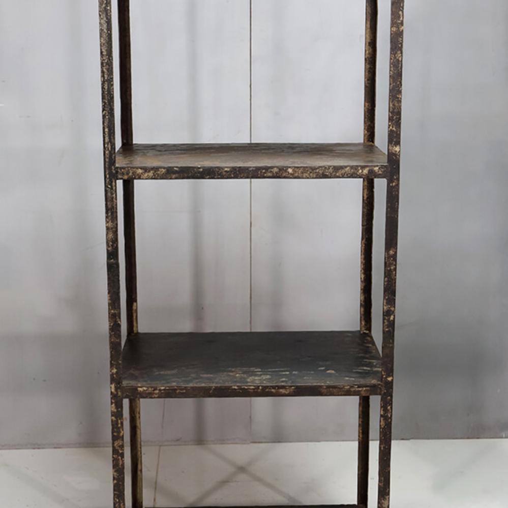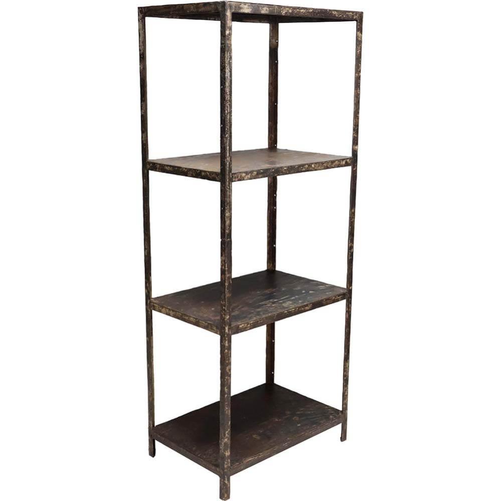 Dieses Regal ist aus alten Schwerlastplatten gefertigt und strahlt einen rauen, industriell inspirierten Charme aus. Mit seiner abgenutzten Metalloberfläche und robusten Konstruktion ist es ein maskulines Möbelstück, das Ihrer Einrichtung Charakter verleiht. Das Regal verfügt über vier Ablagen, die viel Stauraum für Bücher, Dekorationsartikel oder andere Gegenstände bieten, die Sie gerne zur Schau stellen möchten. Perfekt für Ladengeschäfte und private Räume, in denen ein rustikales, upcyceltes Element mit viel Geschichte und Persönlichkeit gefragt ist. Der Abstand zwischen den Fachböden beträgt 44 cm.