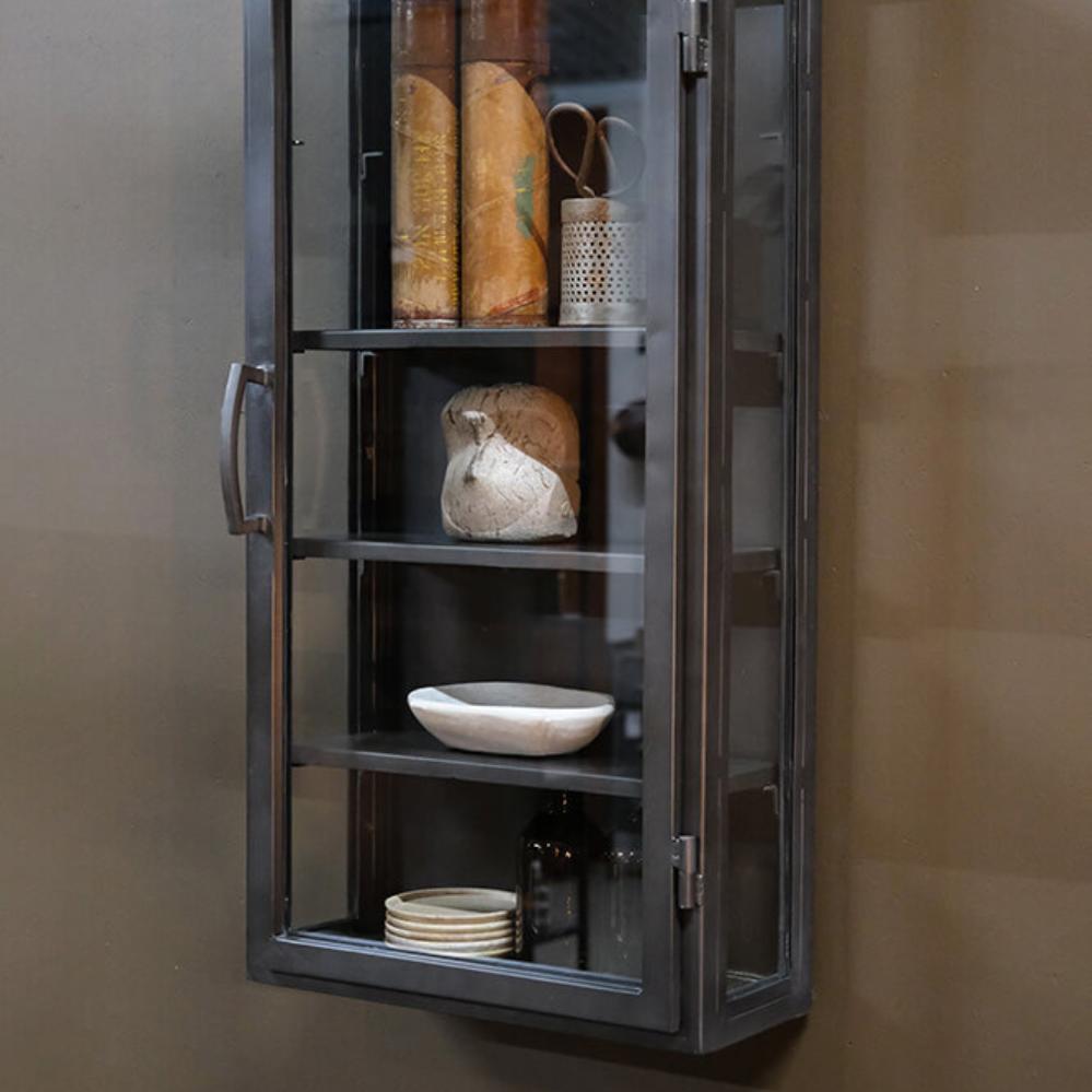 Dieser Wandschrank aus Eisen mit einer Glastür und verstellbaren Fächern ist die perfekte Aufbewahrungslösung in Ihrer Einrichtung. Das rustikale Eisenmaterial verleiht dem Schrank eine robuste und industriell inspirierte Ästhetik, die sich nahtlos in jede Einrichtung einfügt. Mit der einfachen, aber stilvollen Glastür können Sie Ihre kleinen Schätze ausstellen, während die verstellbaren Fächer es Ihnen ermöglichen, den Stauraum nach Ihren Bedürfnissen anzupassen. Hängen Sie ihn in der Küche, im Badezimmer oder im Wohnzimmer auf, um Funktionalität und Charme hinzuzufügen. Der Abstand zwischen den Fachböden beträgt 14 cm.