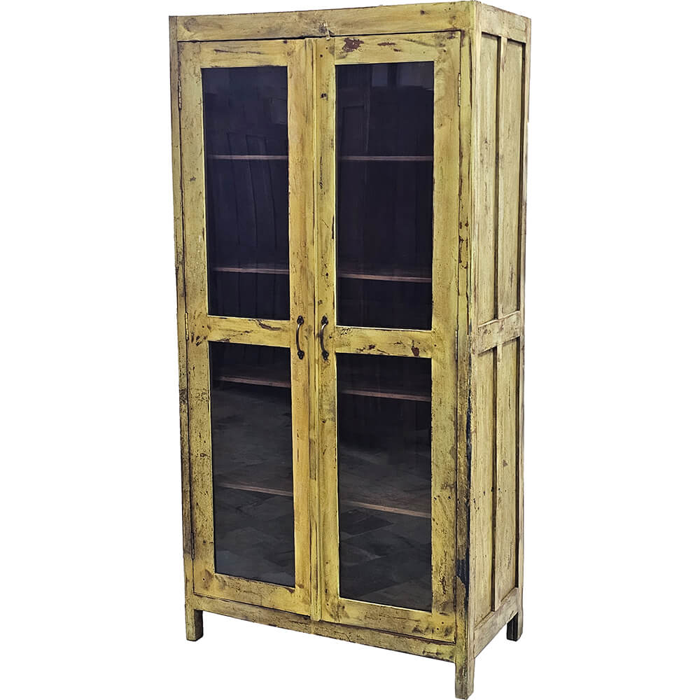 Diese alte Vitrine ist ein echter Blickfang, nicht zuletzt wegen ihrer schönen, abgenutzten gelben Oberfläche, die dem Möbelstück viel Charme und Persönlichkeit verleiht. Die großen Glastüren machen es leicht, Ihre Lieblingsstücke zu präsentieren, ob Keramik, Glas, Bücher oder Dekoobjekte, die einen Platz im Rampenlicht verdienen. Innen finden Sie geräumige Böden mit Platz für sowohl Dekoartikel als auch Aufbewahrung. Die Patina des Holzes zeigt deutlich, dass dieser Schrank ein langes und gutes Leben hinter sich hat. Kleine Rissen, Farbschattierungen und Gebrauchsspuren gehören zu seinem einzigartigen Ausdruck und sind genau das, was ihm in einem modernen Zuhause Charakter verleiht. Perfekt für das Wohnzimmer, die Küche oder den Eingangsbereich, wenn Sie Ihrer Einrichtung Wärme, Farbe und Authentizität hinzufügen möchten. Eine Vitrine mit viel Seele und einem Look, den Sie in neuen Möbeln nicht finden.