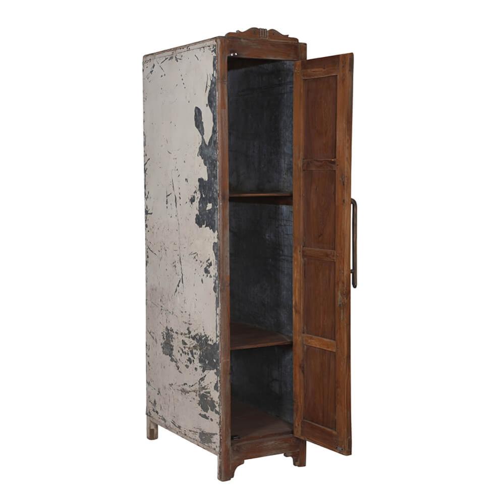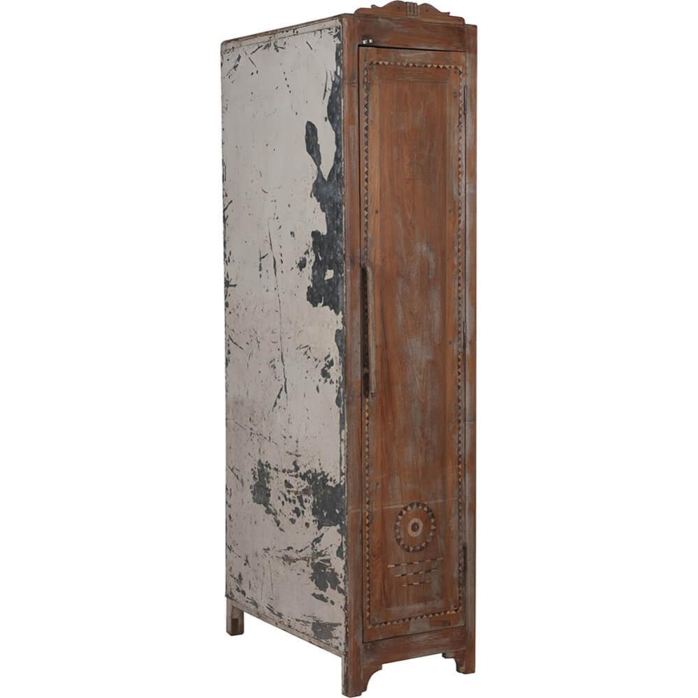 Hoher, schlichter, alter Holzschrank mit sehr schönen Details in der Holztür. Der Schrank ist tief und bietet viel Stauraum, verfügt über eine Tür und zwei Regale. Seiten- und Rückabdeckungen sind aus Metall. Der große Schrank lässt sich wunderbar als Garderobe in der Hütte, im Flur, im Schlafzimmer oder im Kinderzimmer nutzen.