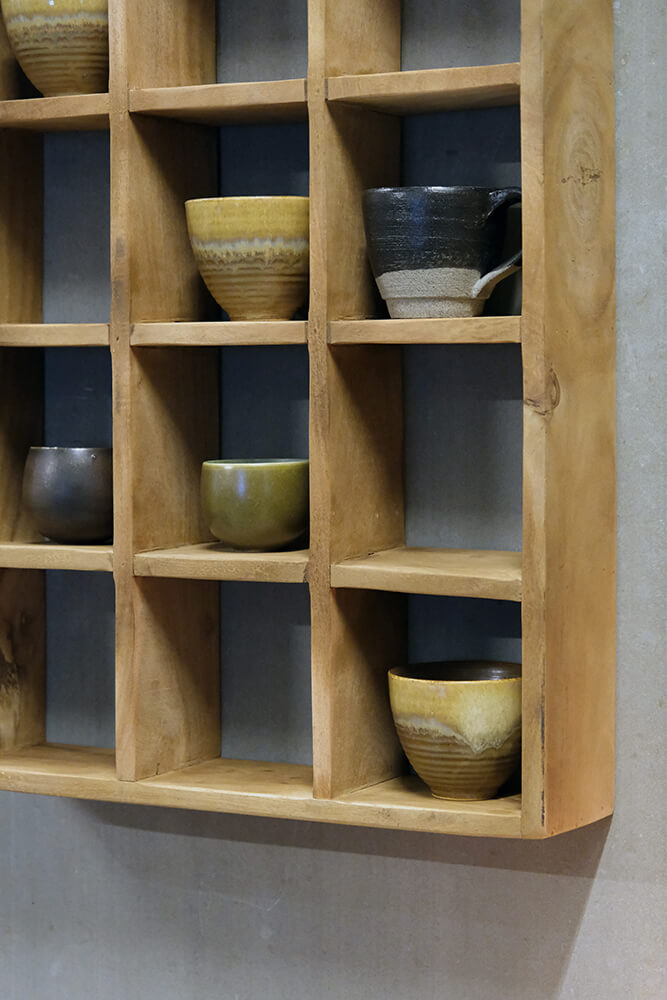 Dieses Regal mit Fächern aus Altholz ist ideal für alle, die ihre Lieblingsstücke stilvoll präsentieren und trotzdem für ein wenig Ordnung sorgen möchten. Gefertigt aus massivem, hellem Holz mit schöner, natürlicher Maserung, ist es in 12 Fächer unterteilt, sodass sich Tassen, Gewürze, kleine Flaschen oder Dekoobjekte gut organisieren lassen. Das Regal wird mit zwei kleinen Eckbeschlägen geliefert und kann sowohl vertikal als auch horizontal aufgehängt werden – je nachdem, was besser zur Wand oder zur Tagesform Ihrer Einrichtung passt. Es kann auch einfach auf einem Regalbrett oder einer Arbeitsplatte stehen. Verwenden Sie es in der Küche, im Café, im Laden oder im Büro. Wo auch immer es steht – dieses Holzregal bringt Wärme, Struktur und einen Hauch rustikaler Schlichtheit in jeden Raum.