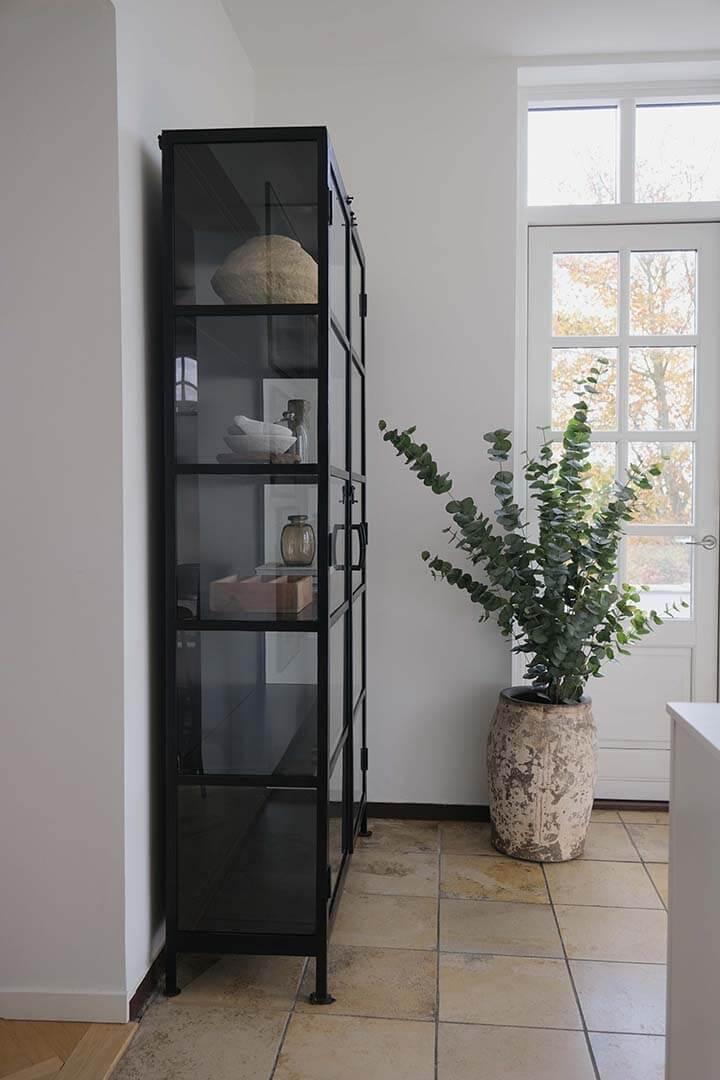 Ein Trademark Living Liebling. Diese fantastische Vitrine aus schwarz lackiertem Eisen bietet alles: Große Geräumigkeit, 5 Fächer und Glas vorne und an den Seiten. Eine köstliche, rohe Vitrine mit einem super coolen Look, der im klassischen und modernen Zuhause großartig aussieht. Ein passendes Sideboard mit zwei Regalen finden Sie unter der Artikelnummer: M09045. Der Abstand zwischen den Fachböden beträgt 34 cm.