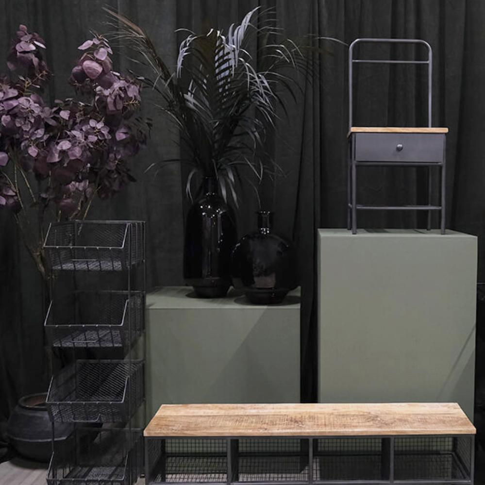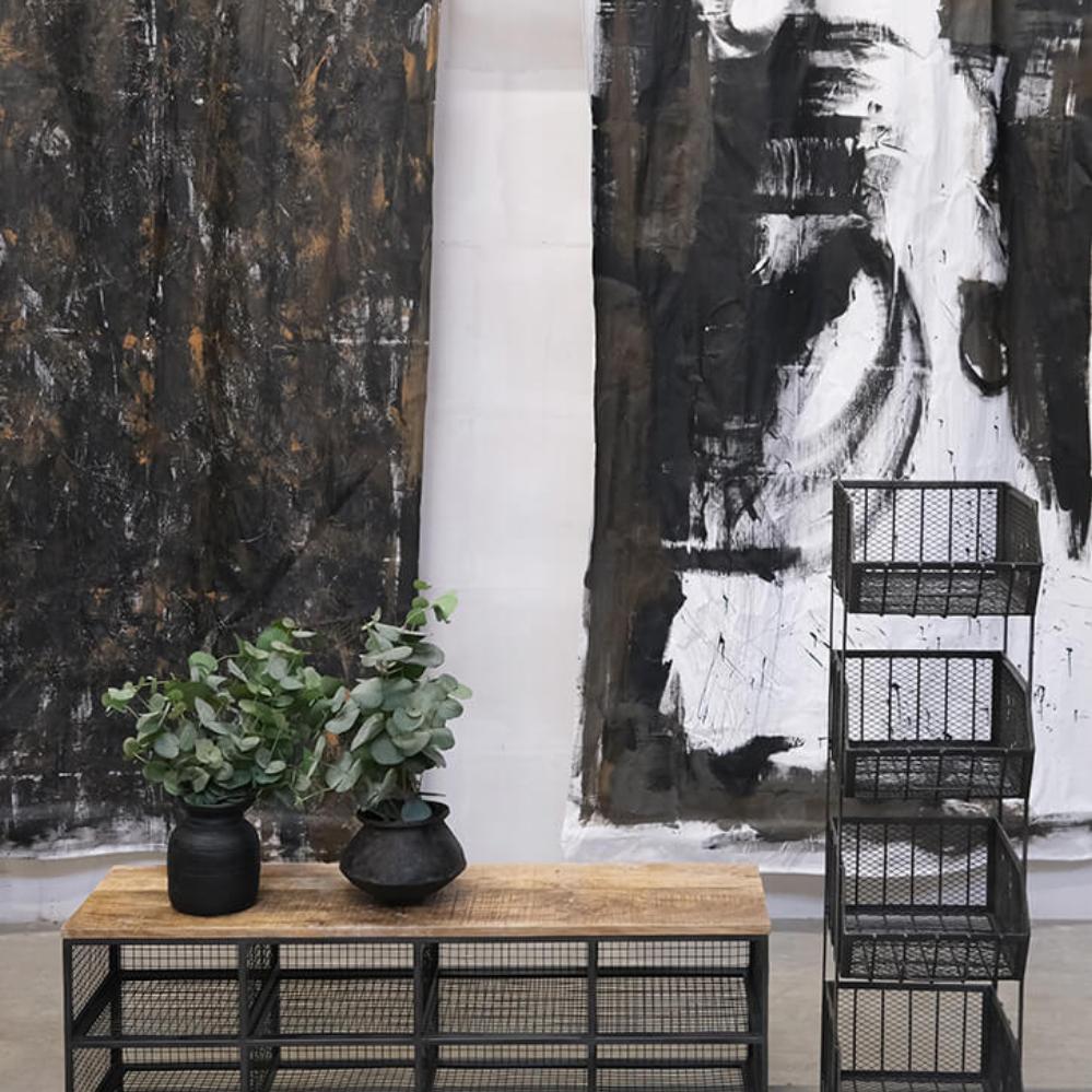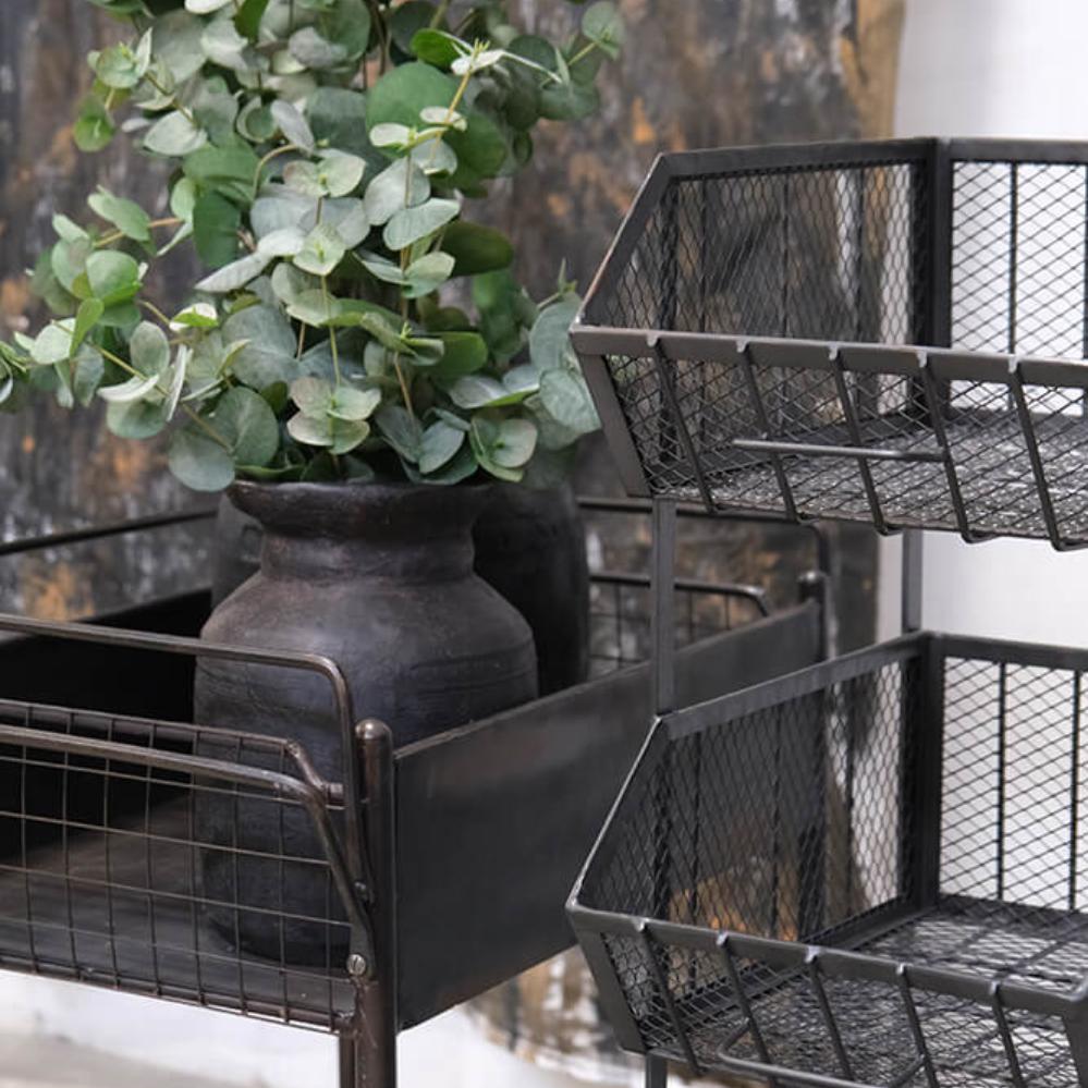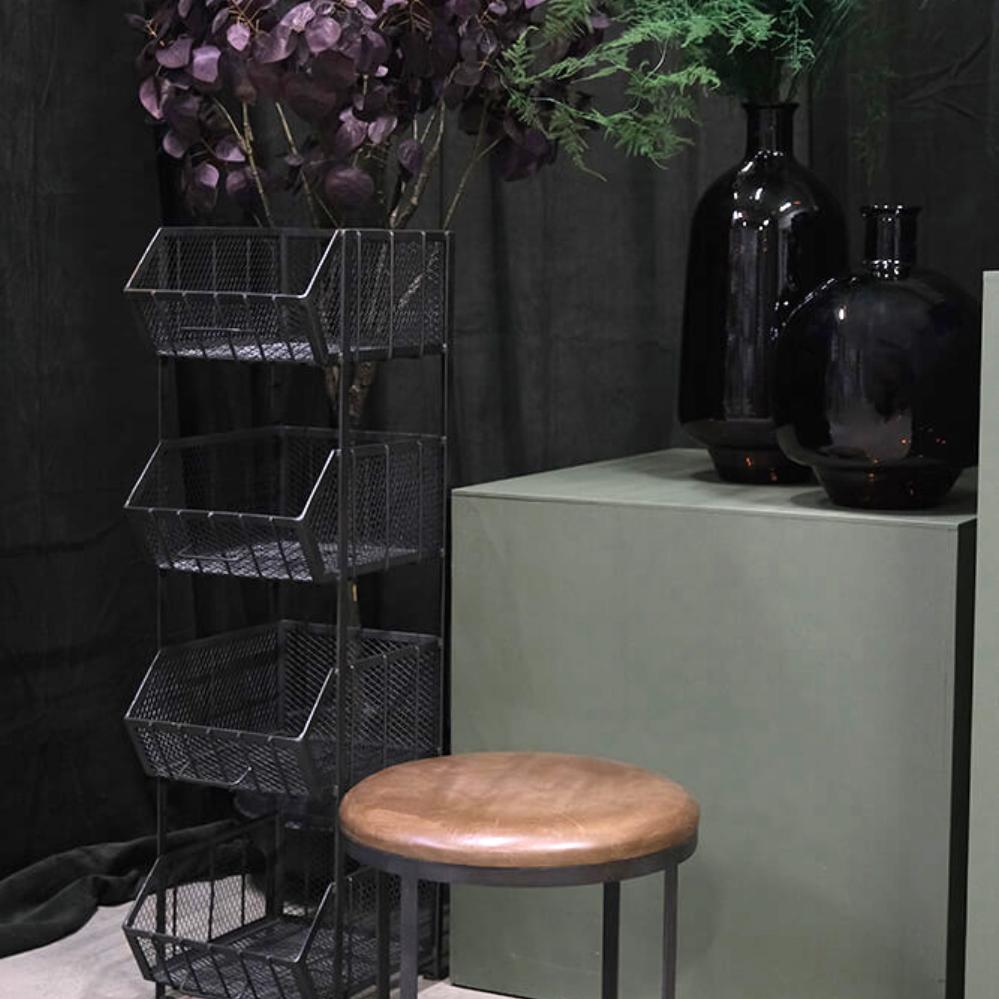 Dieses Regal mit 4 Körben ist eine praktische und stilvolle Aufbewahrungslösung, die industriellen Charme versprüht. Mit seinem robusten Metallrahmen und geräumigen Drahtkörben bietet es nicht nur Platz zur Aufbewahrung, sondern auch einen rauen und zeitlosen Look, der perfekt in das moderne Zuhause oder den Laden passt. Jeder Korb hat ein schräges Design, sodass der Inhalt leicht ersichtlich und zu greifen ist – ideal für alles, von Zeitschriften und Textilien bis hin zu Küchenutensilien und kleinen Gegenständen, die sonst leicht verloren gehen. Dieses Regal ist nicht nur ein funktionelles Aufbewahrungsmöbel, sondern auch einen Blickfang, der dem Raum Charakter und Authentizität verleiht.
