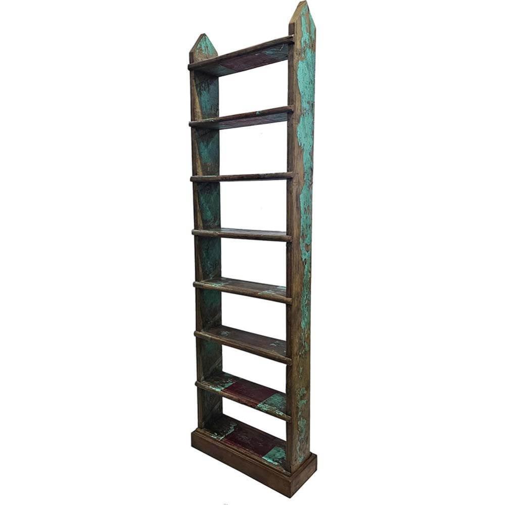 Dieses hohe, schlanke Regal war früher eine Treppe. Jetzt hat es einen neuen Zweck bekommen, und jede Menge Charakter. Gefertigt aus massivem Holz, hat es eine Patina mit abgenutzten grünen Nuancen, die ihm einen rohen, besonderen und absolut authentischen Look verleihen. Die Geschichte steckt im Holz. Die handgefertigten Stufen, die jetzt als Regalböden dienen, zeigen Spuren der Zeit, aber auch von Sorgfalt und Handwerkskunst. Die rustikale Oberfläche und die ungleichmäßigen Farben erzählen von Wiederverwendung und Upcycling. Nutzen Sie das Regal in einem Café oder Restaurant für Speisekarten, Geschirr oder Deko. Oder bringen Sie damit Vintage-Charme und Charakter in Ihr Geschäft oder Wohnzimmer. Es eignet sich auch wunderbar als alternatives Bücherregal, Pflanzenständer oder Ausstellungsfläche für Ihre Lieblingsstücke – mit Stil und Geschichte. Regalabstand ca. 28 cm. Regaltiefe 20 cm.