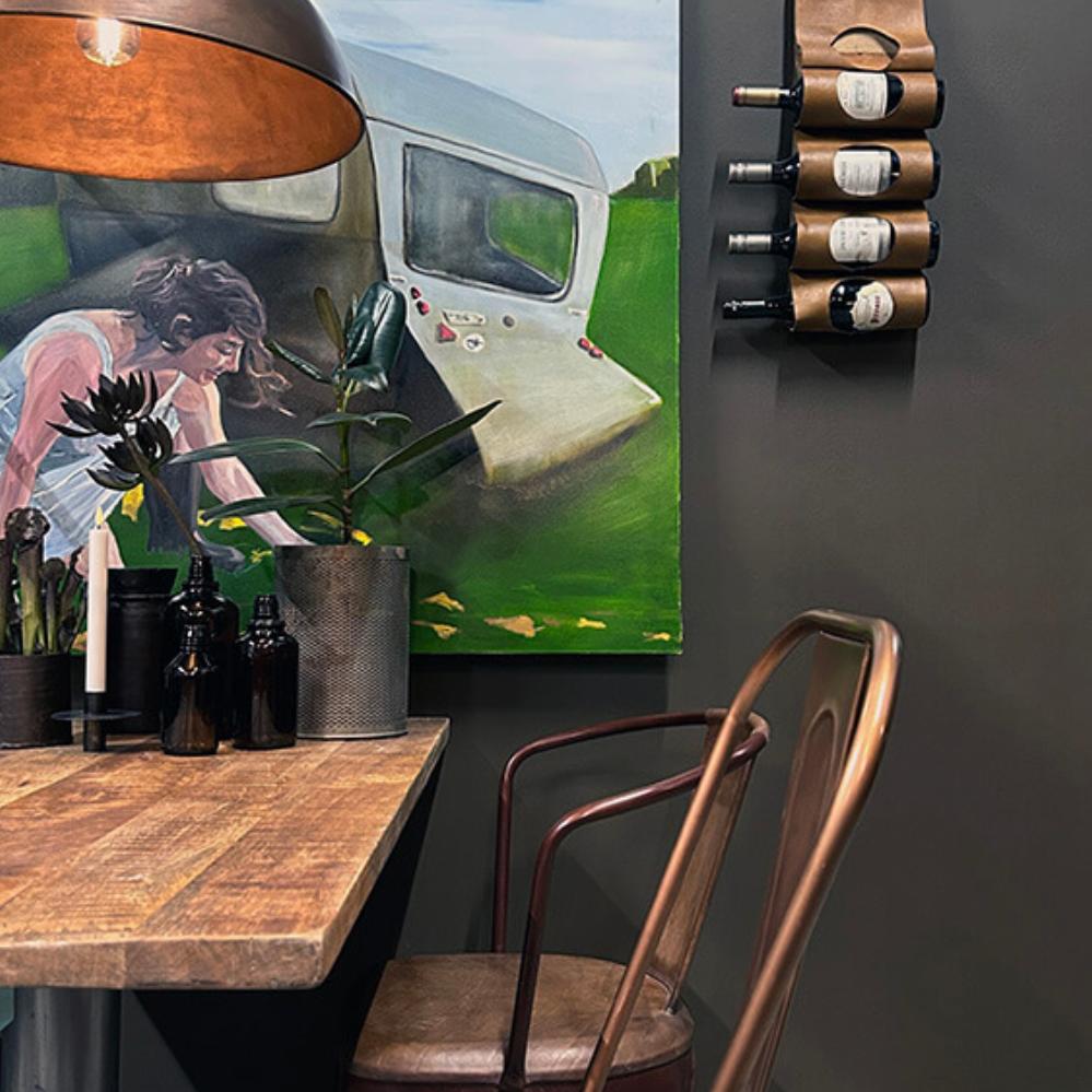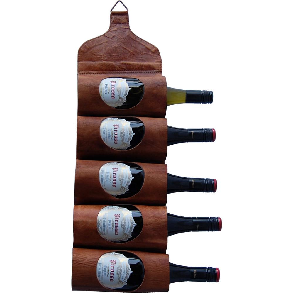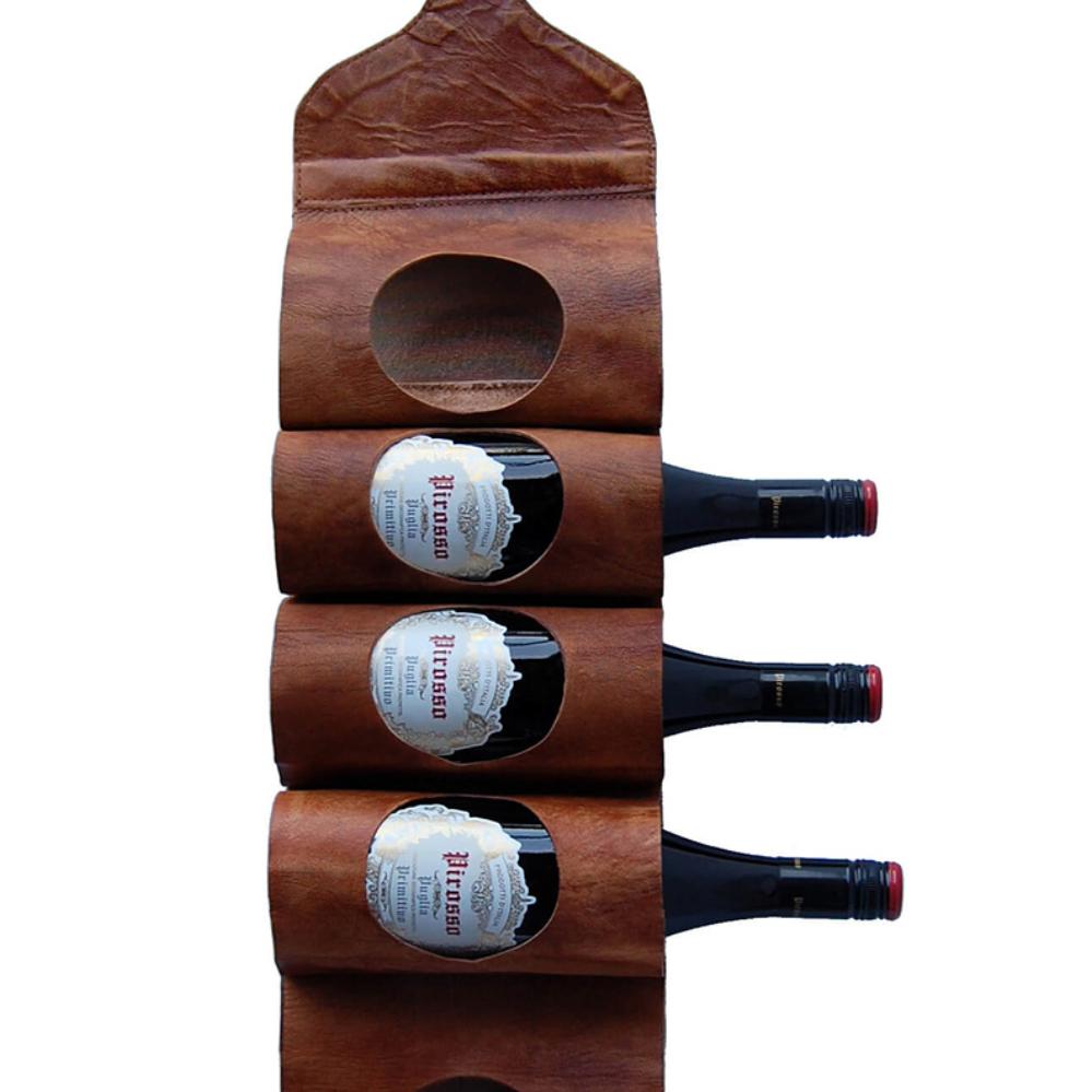 Multifunktionshalter - Zeitschriftenhalter oder ein Weinhalter aus braunem Leder mit Platz für 5 Flaschen, 5 Zeitschriften - oder eine Mischung aus beiden. Ein Halter in einem rustikalen Look mit Blick für Qualität und im skandinavischen Stil. Ein Design mit Fokus auf die kleinen Details. Durch die Löcher im Leder können Sie das Etikett auf der Weinflasche oder den Namen des Magazins sehen. Der kleine Halter nimmt nicht viel Platz ein und passt daher in die meisten Häuser und sieht auch an der Wand in Ihrem Café oder Restaurant gut aus.