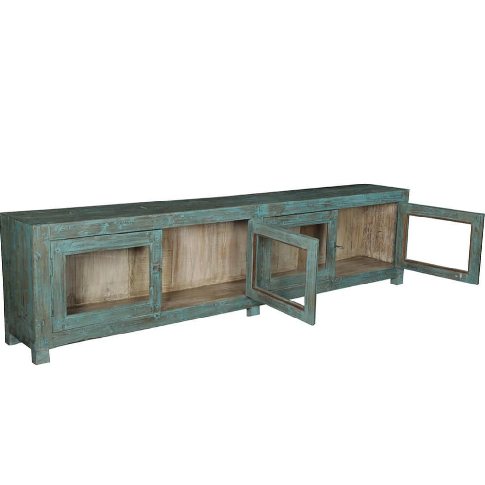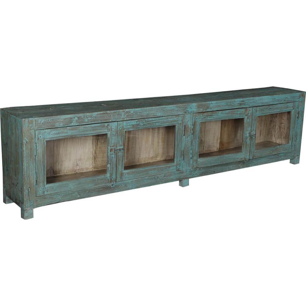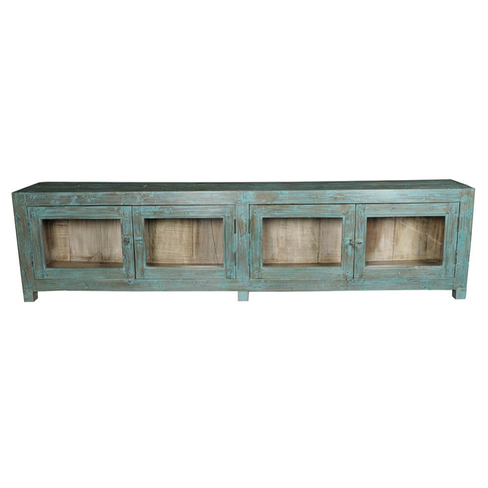 Dieses langes Sideboard strahlt Geschichte und Charakter aus. Das Sideboard hat die schönste blau patinierte Farbe auf der Außenseite, während die helle Farbe im Inneren den ausgestellten Gegenständen Wärme verleiht. Der Raum hinter den vier Glastüren bietet eine perfekte Aufbewahrungsmöglichkeit mit dem gewissen Etwas. Dieses Sideboard hat seinen Ursprung in den Handwerkstraditionen Indiens, wo jeder Kratzer und jeder Farbton eine Geschichte vom Lauf der Zeit erzählt. Das abgenutzte Finish verleiht dem Sideboard einen authentischen und lebendigen Ausdruck, den nur echter Vintage verleihen kann. Platzieren Sie es in Ihrem Restaurant als rustikales und gemütliches Aufbewahrungsmöbel, das gleichzeitig als dekoratives Element dient. In Ihrem Geschäft kann das Sideboard Produkte sowohl hinter den Türen als auch oben auf dem Sideboard präsentieren, oder es kann als niedrige Theke funktionieren. In Ihrem Zuhause kann das Sideboard als Statement-Möbelstück dienen, das im Wohnzimmer oder in der Küche zum Blickfang wird.