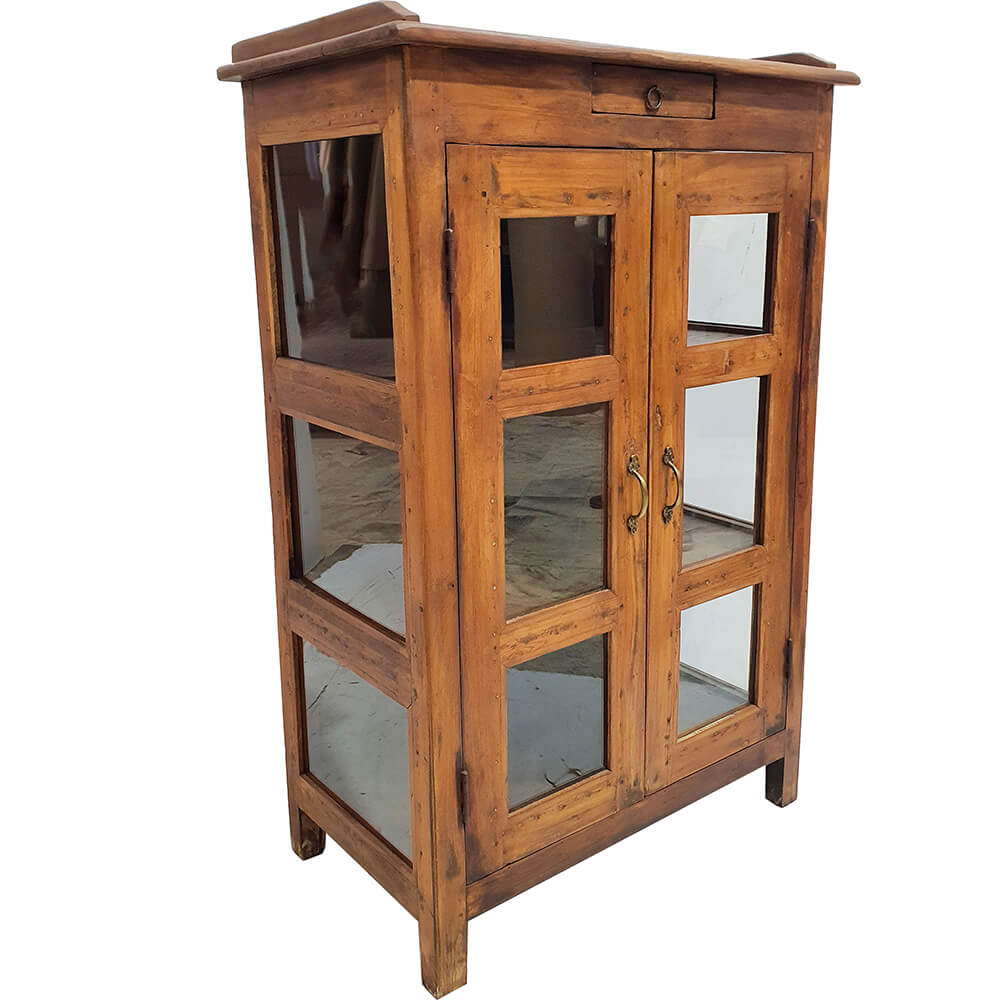 Diese schöne alte Vitrine ist ein Möbelstück voller Persönlichkeit und Charme. Die vielen Glasfelder verleihen ihr einen leichten und luftigen Ausdruck und ermöglichen gleichzeitig einen schönen Blick auf alles, was Sie auf den Böden platzieren. Perfekt für Keramik, Glas, Bücher, Nippes oder kleine Sammlungen. Das Holz besitzt die genau richtige Patina mit Gebrauchsspuren, Marken und Farbschattierungen, die seine eigene Geschichte erzählen und diese Vitrine zu einem echten Unikat machen. Oben befindet sich eine kleine Schublade, ideal für Kleinigkeiten, die Sie gerne griffbereit haben. Ein charaktervolles Möbelstück, das im Wohnzimmer, in der Küche oder in Ihrem Geschäft gleichermaßen gut funktioniert und dem Raum Wärme und einen Hauch Vintage-Atmosphäre verleiht.