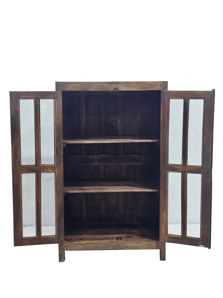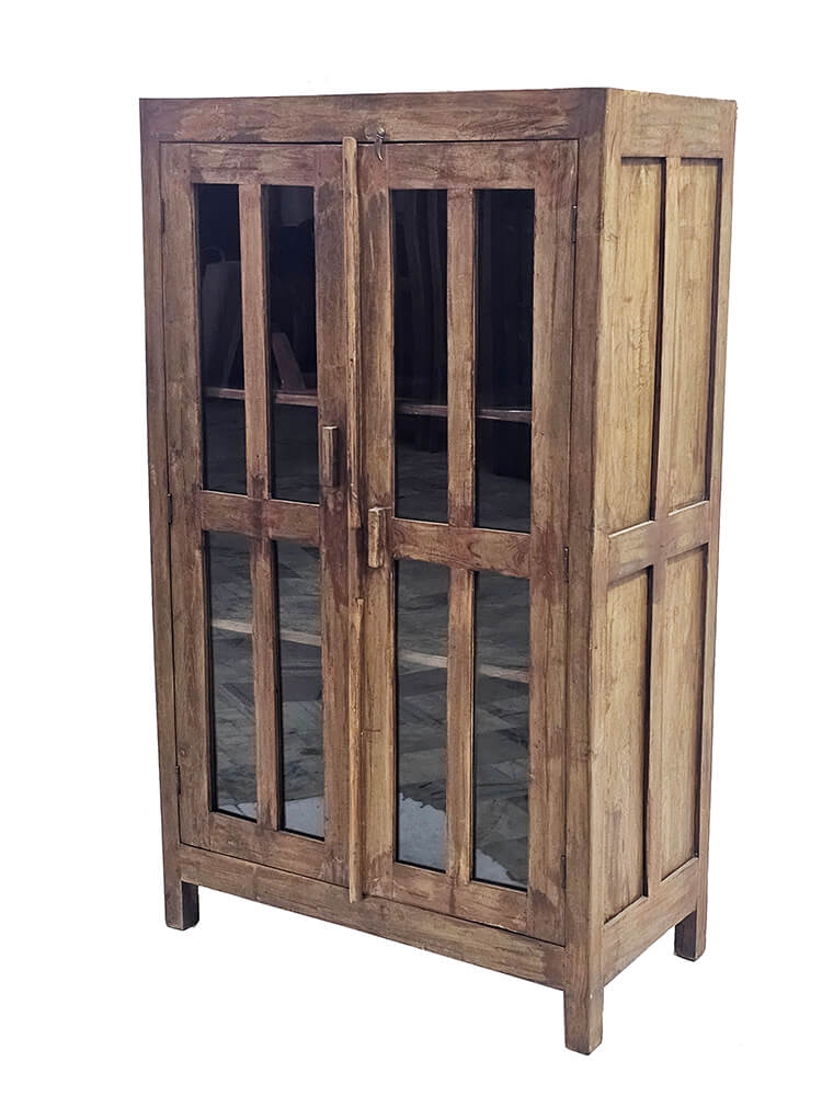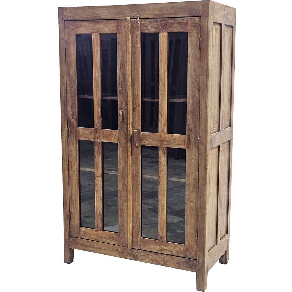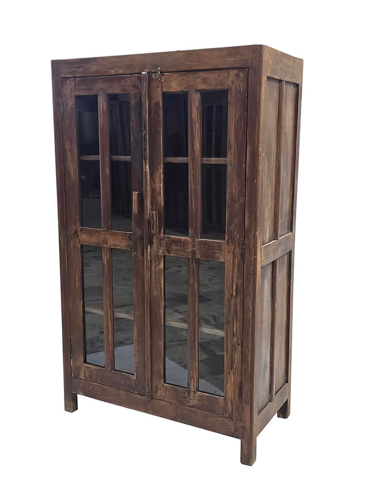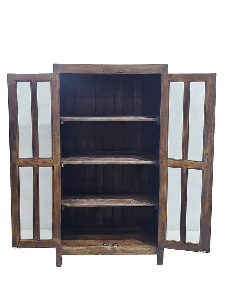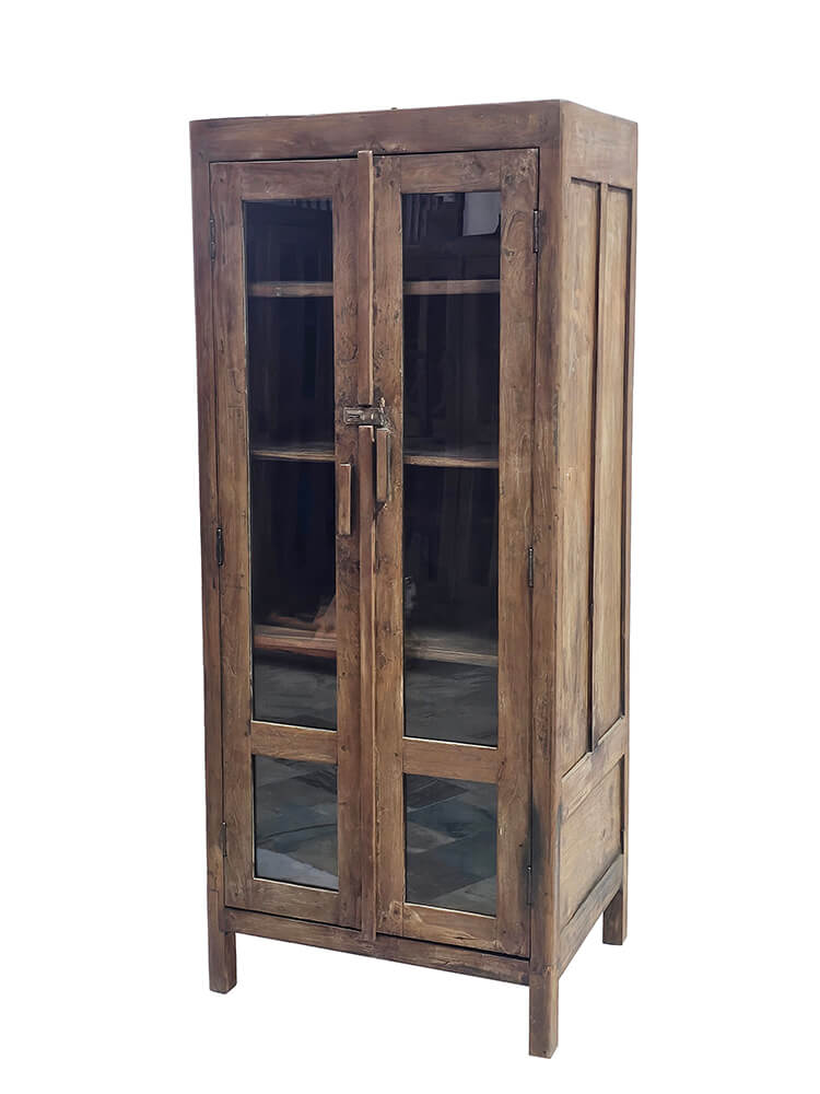 Diese alten Vitrinenschränke sind charaktervolle Möbelstücke mit einem warmen und rustikalen Ausdruck. Die Schränke variieren in Ausführung, Details und Größe, sodass jeder einzelne Schrank seinen eigenen Charakter und seine eigene Geschichte hat. Das natürliche Farbspiel des Holzes, Gebrauchsspuren und Patina sorgen für ein ehrliches und lebendiges Erscheinungsbild, das sich bei neuen Möbeln nicht nachahmen lässt. Die verglasten Türen schaffen einen leichten und offenen Ausdruck und machen die Schränke ideal zur Aufbewahrung und Präsentation von Porzellan, Gläsern, Büchern oder dekorativen Objekten. Im Inneren bieten die Schränke Böden mit viel Platz, während das massive Holz für eine solide und funktionale Konstruktion sorgt. Die Vitrinenschränke passen hervorragend in Wohnzimmer, Küche oder Eingangsbereich und funktionieren ebenso gut in privaten Wohnungen wie in Geschäft, Café oder Showroom. Eine ideale Wahl für alle, die ein einzigartiges Möbelstück mit Seele suchen, bei dem Unterschiede Teil des Charmes sind.